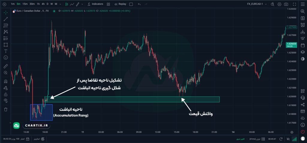 نکتهی اضافی: پیش از تشکیل یک ناحیه تقاضا، معمولاً قیمت در یک محدودهی تجمیع (Accumulation Range) نوسان میکند (بر اساس نظریه وایکاف). این محدودهی تجمیع دورهای است که طی آن «پول هوشمند» (Smart Money) بهتدریج در حال جمعآوری سفارشات حجیم است. اگر پس از آن شاهد یک شکست قدرتمند از ناحیهی تقاضایی باشید که روی ناحیهی تجمیع ساخته شده، این نشاندهندهی یک ناحیه تقاضای باکیفیت است، زیرا احتمالاً نشانهای از فعالیت تریدرهای بزرگ مثل بانکهاست.