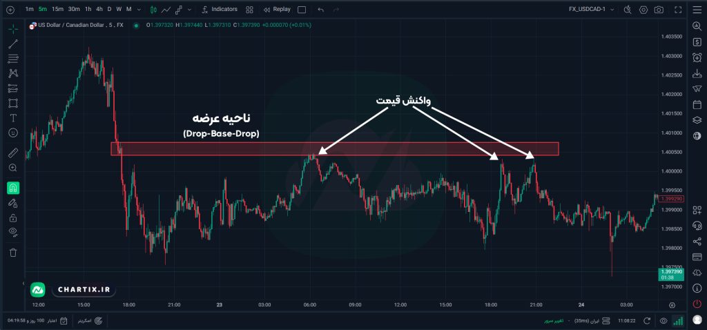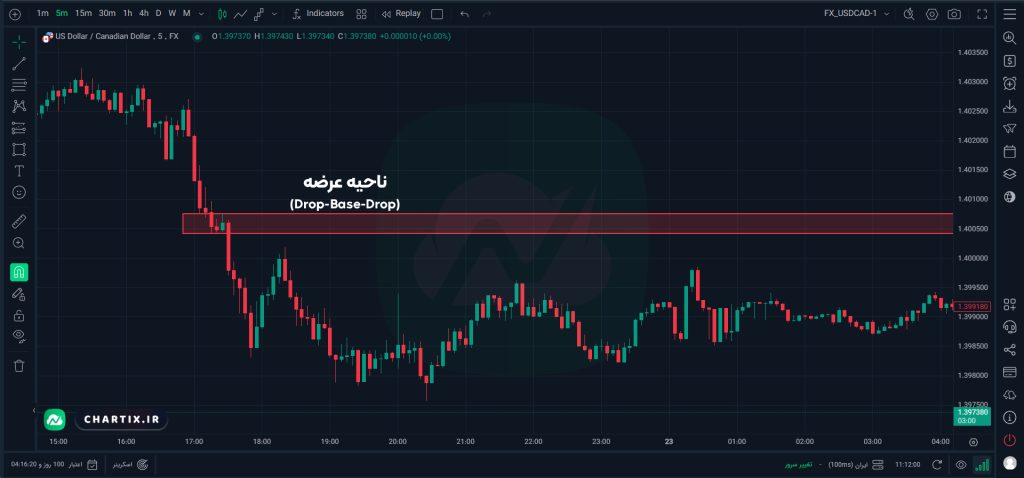 نکتهی اضافی: سناریوی بالا با عنوان ساختار “Drop-Base-Drop” شناخته میشود. ناحیهی عرضه در این حالت درون یک فاز بازار با روند قوی شکل میگیرد. هرچه فاز Base کوتاهتر باشند، روند نزولی کلی قویتر است.