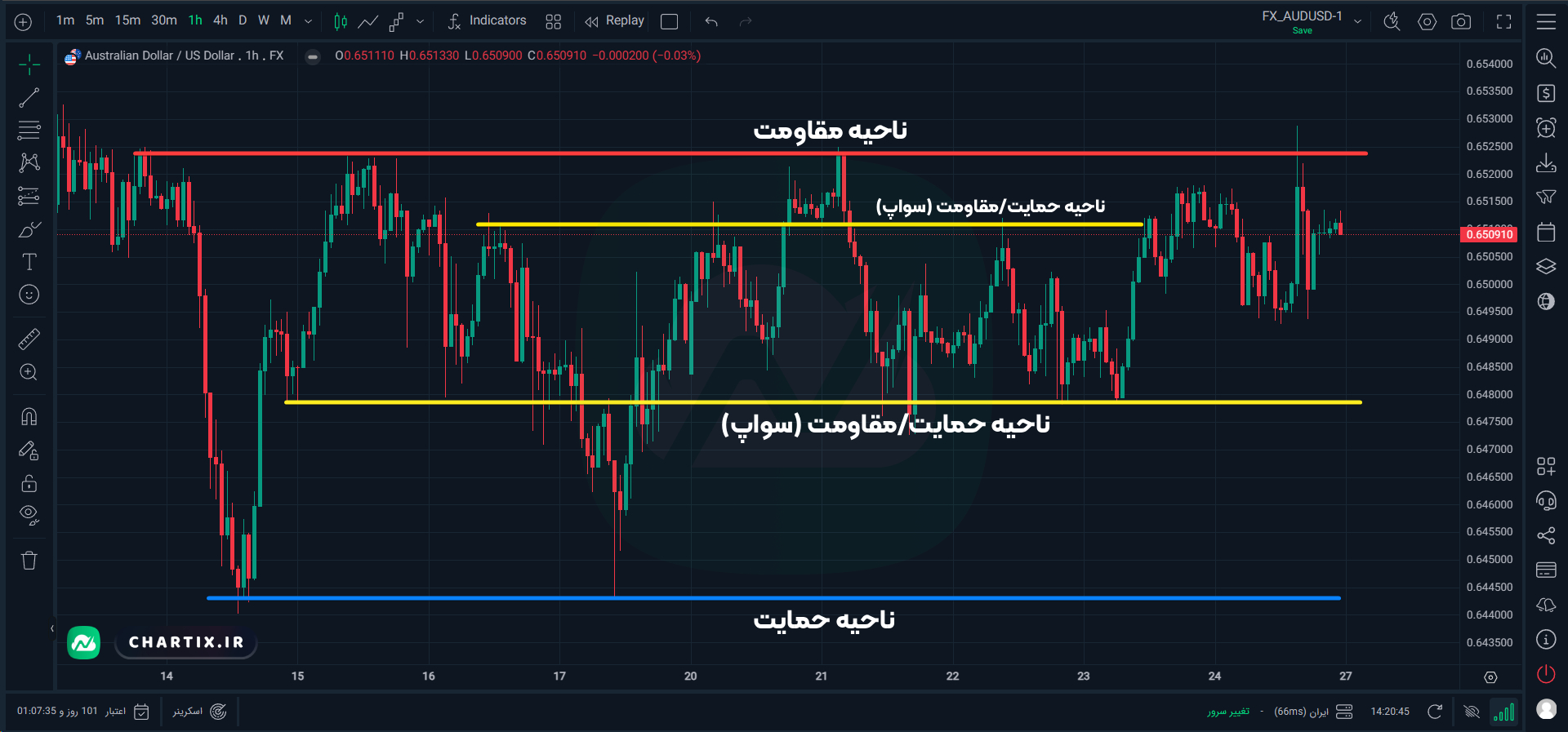 اگرچه مفهوم عرضه و تقاضا تا حدی مشابه حمایت و مقاومت است، اما تفاوتهای مهمی میان این دو وجود دارد. در حالی که سطوح حمایت و مقاومت صرفاً در نقاط چرخش قیمت شکل میگیرند، نواحی عرضه و تقاضا در ریشه حرکات پرقدرت و روندهای قوی یافت میشوند. تصویر زیر نواحی عادی حمایت و مقاومت را نشان میدهد که نقاط چرخش قیمت را مشخص کردهاند. بسیاری از تریدرها در استفاده از حمایت و مقاومت دچار مشکل میشوند، زیرا قیمت معمولاً در این سطوح سریع واکنش نشان میدهد و فرصتهای ورود راحتی فراهم نمیکند.