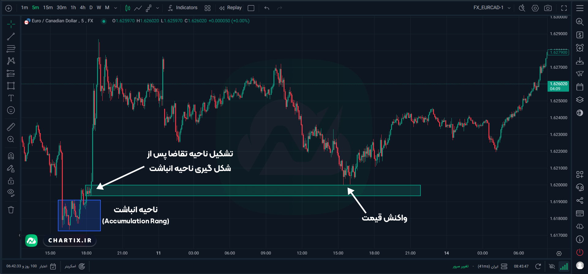 نکتهی اضافی: پیش از تشکیل یک ناحیه تقاضا، معمولاً قیمت در یک محدودهی تجمیع (Accumulation Range) نوسان میکند (بر اساس نظریه وایکاف). این محدودهی تجمیع دورهای است که طی آن «پول هوشمند» (Smart Money) بهتدریج در حال جمعآوری سفارشات حجیم است. اگر پس از آن شاهد یک شکست قدرتمند از ناحیهی تقاضایی باشید که روی ناحیهی تجمیع ساخته شده، این نشاندهندهی یک ناحیه تقاضای باکیفیت است، زیرا احتمالاً نشانهای از فعالیت تریدرهای بزرگ مثل بانکهاست.