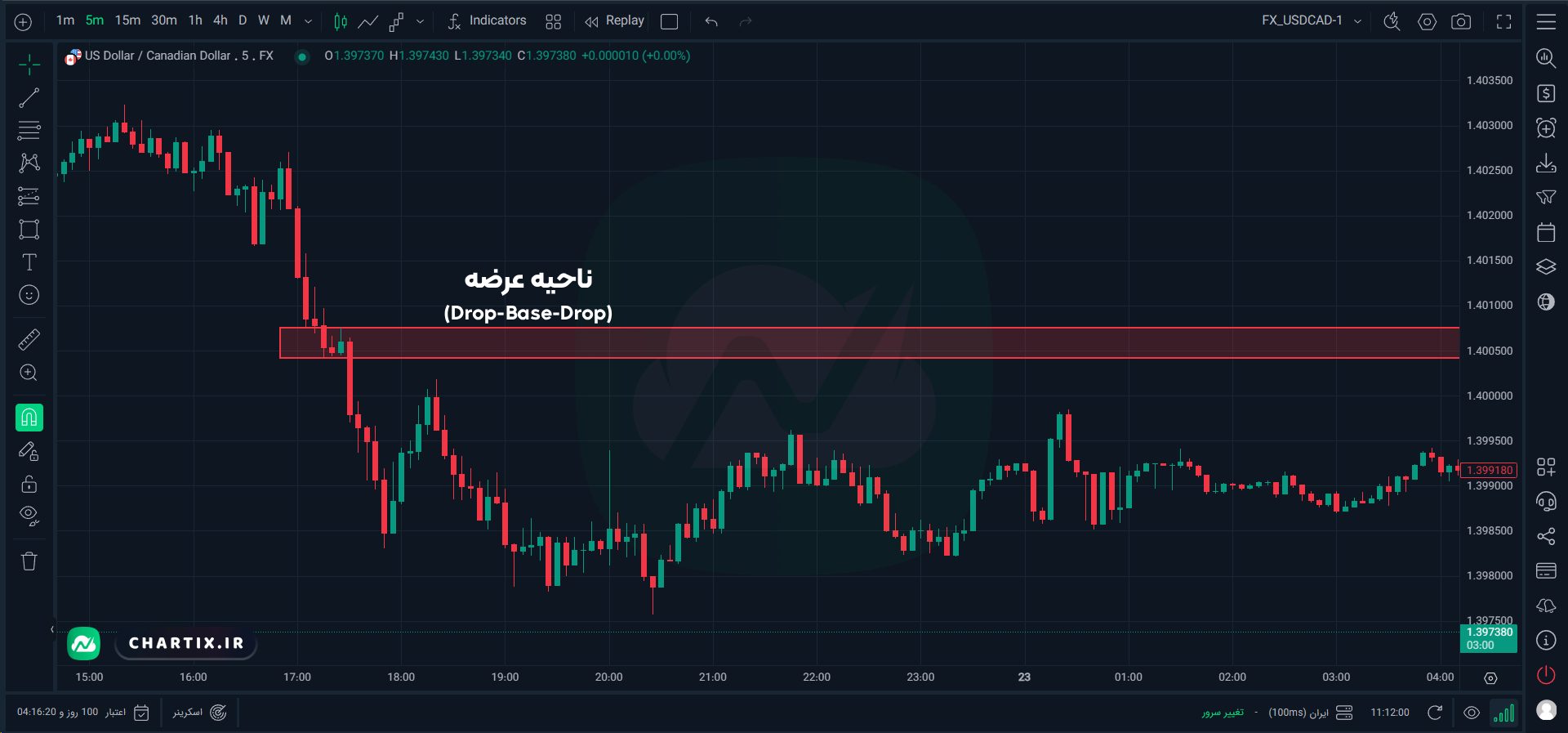 نکتهی اضافی: سناریوی بالا با عنوان ساختار “Drop-Base-Drop” شناخته میشود. ناحیهی عرضه در این حالت درون یک فاز بازار با روند قوی شکل میگیرد. هرچه فاز Base کوتاهتر باشند، روند نزولی کلی قویتر است.