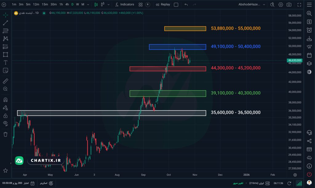 در تایمفریم روزانه آبشده نقدی، مشاهده میکنیم که قیمت در ماههای اخیر روند روبهرشد و صعودی از خود بر جای گذاشته که قدرت گرفته از روند افزایشی قیمت دلار و انس جهانی طلا میباشد. آبشده نقدی پس از شکست محدوده ۳۵,۶۰۰,۰۰۰ – ۳۶,۵۰۰,۰۰۰ تومان (محدوده سفید) بهسمت بالا، شاهد یک پولبک قیمتی بوده است که پس از تکمیل این پولبک، قیمت با شیب تندتری به روند صعودی ادامه داده است. آبشده در هفتههای اخیر توانست سقف قیمتی جدیدی را ایجاد کند که این سقف تاریخی قیمت، در محدوده ۴۹,۱۰۰,۰۰۰ – ۵۰,۴۰۰,۰۰۰ تومان (محدوده آبی) قرار دارد. همانطور که در تصویر زیر مشاهده میکنید، قیمت پس از ایجاد این سقف، شروع به اصلاح کرده است و در حال حاضر آبشده نقدی در بازار، با قیمت ۴۶,۶۳۰,۰۰۰ تومان در حال معامله میباشد. طبق تحلیل گذشته آبشده نقدی که در تاریخ ۲۰ مهر از آکادمی چارتیکس منتشر شد (لینک)، انتظار اصلاح قیمت آبشده نقدی از سقف قیمتی تا محدوده ۴۴,۳۰۰,۰۰۰ – ۴۵,۲۰۰,۰۰۰ تومان (محدوده قرمز) داشتیم که در حال حاضر مشاهده میکنید قیمت تا این محدوده ریزش کوچکی را تجربه کرده است و شاهد حمایت مناسب از محدوده قرمز بهسمت بالا هستیم. در حالت کلی، انتظار افزایش مجدد قیمتی از آبشده را خواهیم داشت و در صورت تثبیت قیمت در بالای محدوده آبی، انتظار رشد قیمتی تا محدوده ۵۳,۸۸۰,۰۰۰ – ۵۵,۰۰۰,۰۰۰ تومان (محدوده نارنجی) خواهیم داشت.