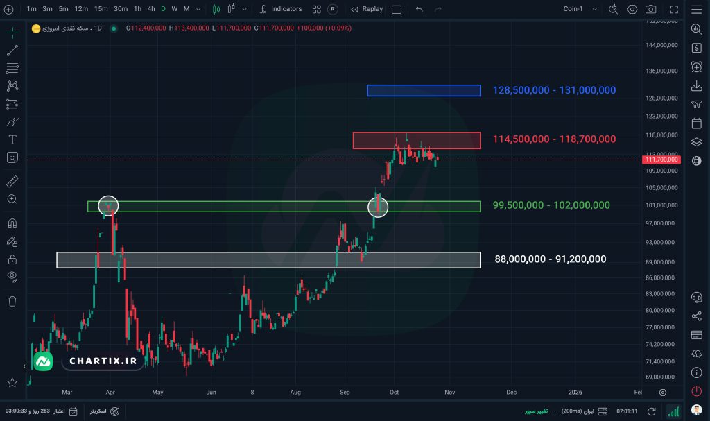 در تایمفریم روزانه سکه، مشاهده میکنیم که قیمت در هفتههای اخیر توانست از سقف قیمتی خود عبور کند و دائم اعداد بالاتری را به خود ببیند. سکه پس از شکست محدوده ۹۹,۵۰۰,۰۰۰ – ۱۰۲,۰۰۰,۰۰۰ تومان (محدوده سبز) بهسمت بالا، با یک پولبک به این سطح توانست شکست سقف تاریخی را تثبیت کند و پس از آن، شاهد حرکت نسبتاً شارپی از سکه نقدی بودهایم. قیمت ۱۵ روز است که درگیر محدوده مقاومتی ۱۱۴,۵۰۰,۰۰۰ – ۱۱۸,۷۰۰,۰۰۰ تومان (محدوده قرمز) میباشد که نشاندهنده قوی بودن محدوده در مهار قیمت است. البته باید به این نکته توجه داشته باشیم که در صورت شکست این محدوده بهسمت بالا، میتوانیم موج جدید رشد قیمت سکه را داشته باشیم و تارگت خود را در محدوده ۱۲۸,۵۰۰,۰۰۰ – ۱۳۱,۰۰۰,۰۰۰ تومان (محدوده آبی) در نظر بگیریم. با توجه به دارایی طلامحور بودن سکه، در صورت افزایش قیمت انس جهانی طلا و دلار، میتوانیم رشد سکه را متصور باشیم. توصیه میشود سرمایهگذارانی که قصد خرید سکه را دارند، در حوالی قیمت ۱۰۸,۰۰۰,۰۰۰ تومان ورود کنند که فرصت مناسبی محسوب میشود.