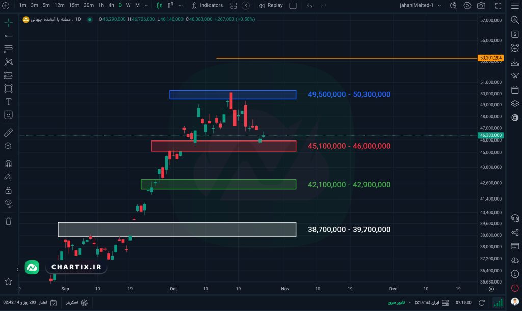 در تایمفریم روزانه مظنه آبشده جهانی، مشاهده میکنیم که از اواسط مردادماه سال جاری روند صعودی آغاز شده است. همانطور که در تصویر زیر مشاهده میکنید، در طول این مسیر صعودی، قیمت توانسته سقف و کفهای بالاتر و متعددی را ایجاد کند که بهراحتی قابل تشخیص میباشد. مظنه آبشده جهانی در این گام صعودی، نوسان خود را از حوالی قیمت ۳۲,۰۰۰,۰۰۰ تومان آغاز کرد و تا حوالی محدوده ۴۹,۵۰۰,۰۰۰ – ۵۰,۳۰۰,۰۰۰ تومان (محدوده آبی) ادامه داد که شامل ۶۴ درصد نوسان روبهبالا میباشد. قیمت پس از برخورد به محدوده آبی، با فشار فروش سنگینی مواجه شده که رفتهرفته باعث اصلاح قیمتی شده است و در حال حاضر مظنه آبشده جهانی با قیمت ۴۶,۳۸۰,۰۰۰ تومان در حال معامله میباشد که در نزدیکی محدوده حمایتی ۴۵,۱۰۰,۰۰۰ – ۴۶,۰۰۰,۰۰۰ تومان (محدوده قرمز) قرار گرفته است. در صورتی که این محدوده بتواند بهخوبی از قیمت حمایت کرده و آن را بهسمت بالا هدایت کند، میتوانیم انتظار حرکت بعدی موج صعودی را داشته باشیم؛ اما در صورت عدم حمایت کافی از قیمت در محدوده قرمز، میتوانیم شاهد ریزش قیمت تا محدوده ۴۲,۱۰۰,۰۰۰ – ۴۲,۹۰۰,۰۰۰ تومان (محدوده سبز) باشیم و سپس از این ناحیه بهسمت بالا حرکتی را خواهیم داشت.