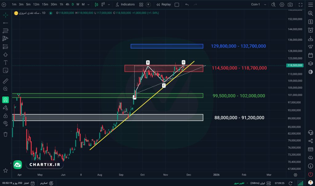 در حال حاضر سکه نقدی در حوالی 118,500,000 تومان معامله میشود که در باکس مقاومتی 114,500,000 – 118,700,000 تومان (محدوده قرمز) قرار دارد. از ابتدای مهرماه قیمت توانسته یک الگوی مثلث صعودی تشکیل دهد که سقف آن همان محدوده استاتیک مقاومتی قرمز است.