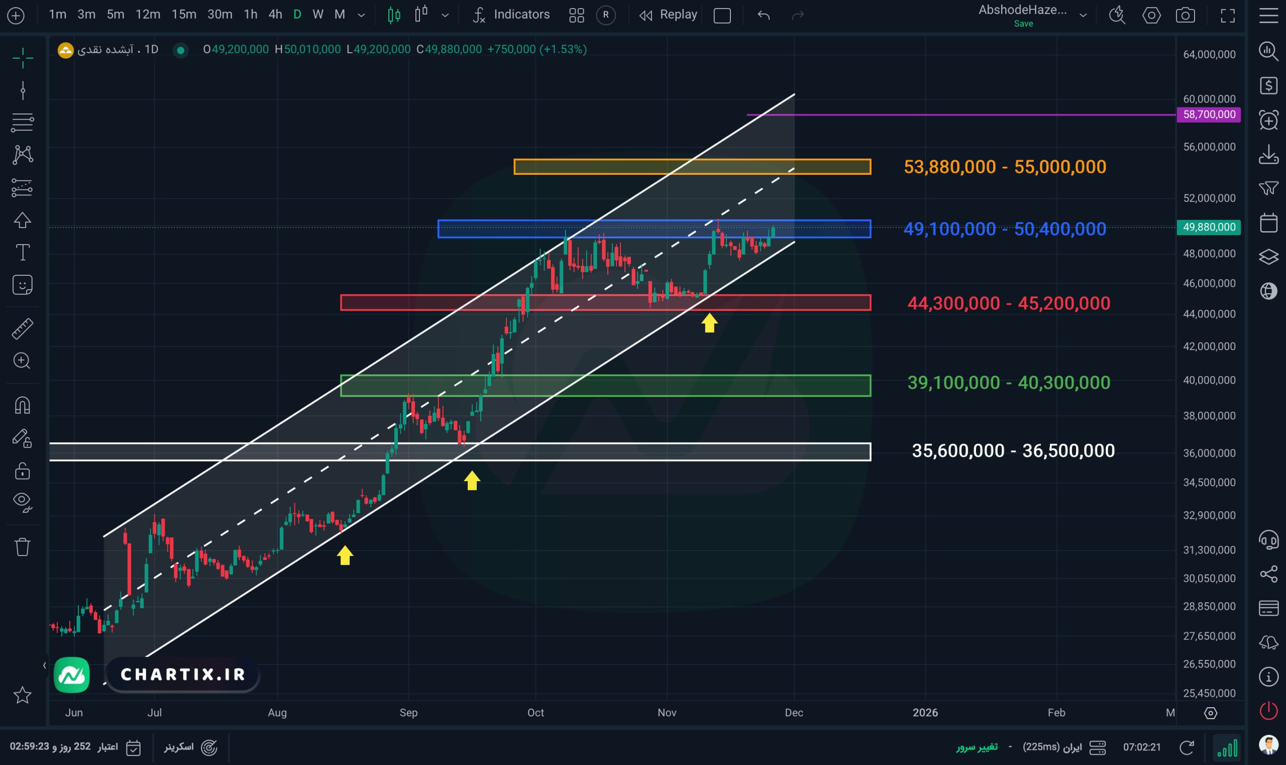 در صورت تثبیت قیمت در بالای محدوده آبی، انتظار خواهیم داشت قیمت بتواند حرکت صعودی جدیدی را آغاز کند. در روند صعودی احتمالی پیشرو، تارگتی که برای آبشده نقدی در نظر داریم، محدودهی 53,880,000 – 55,000,000 تومان (محدوده نارنجی) خواهد بود. در صورت رسیدن قیمت به این محدوده، شاهد ریاکشنهای قیمتی و احتمال اصلاح به دلیل قرارگیری این ناحیه در مجاورت خط میدلاین کانال صعودی خواهیم بود.