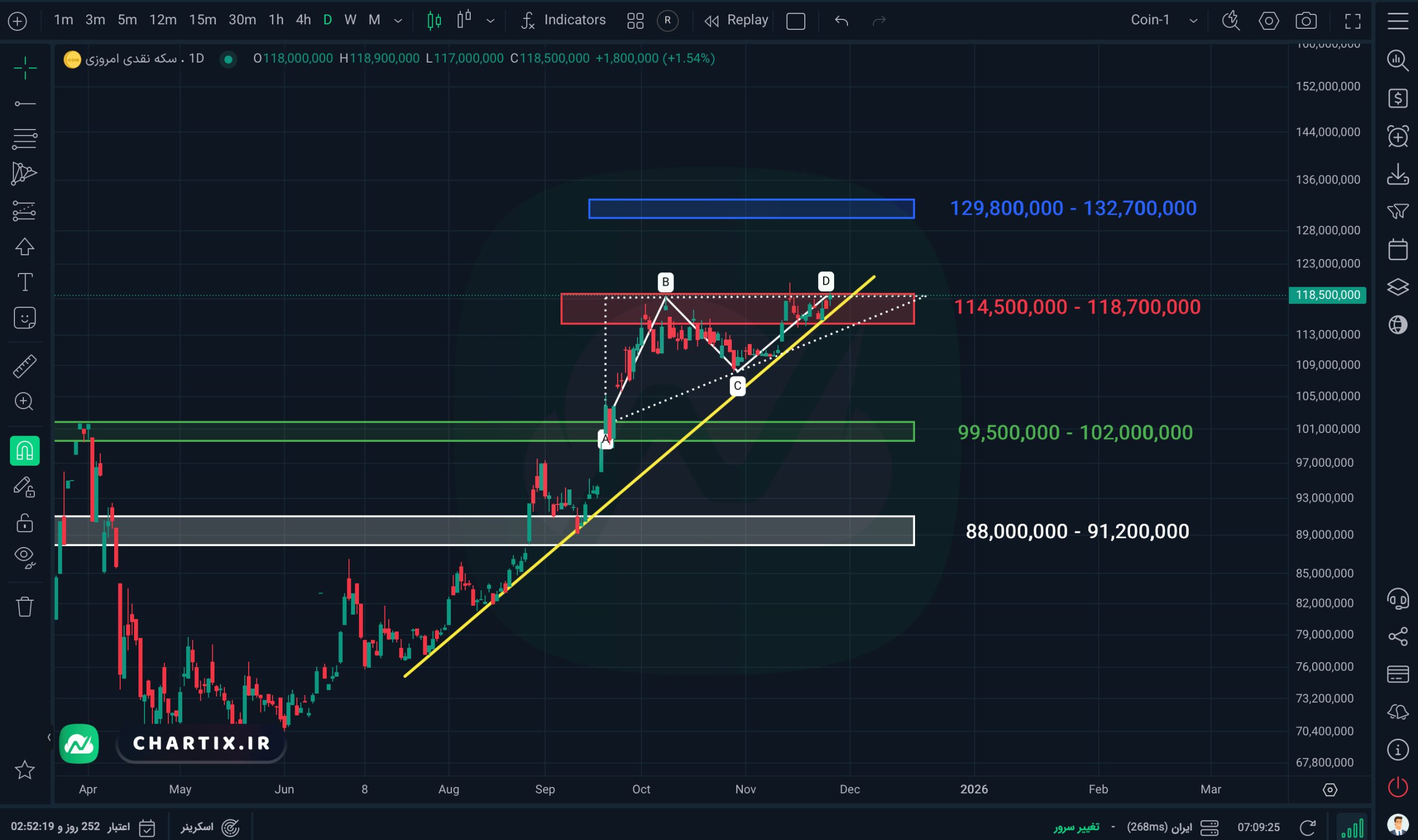 بهصورت کلی در الگوی مثلث صعودی، قیمت تمایل بیشتری به شکست سقف دارد. در نتیجه در صورت موفقیت قیمت در شکست محدودهی قرمز و تثبیت بالای آن، انتظار افزایش قیمت تا محدودهی 129,800,000 – 132,700,000 تومان (محدوده آبی) را خواهیم داشت.