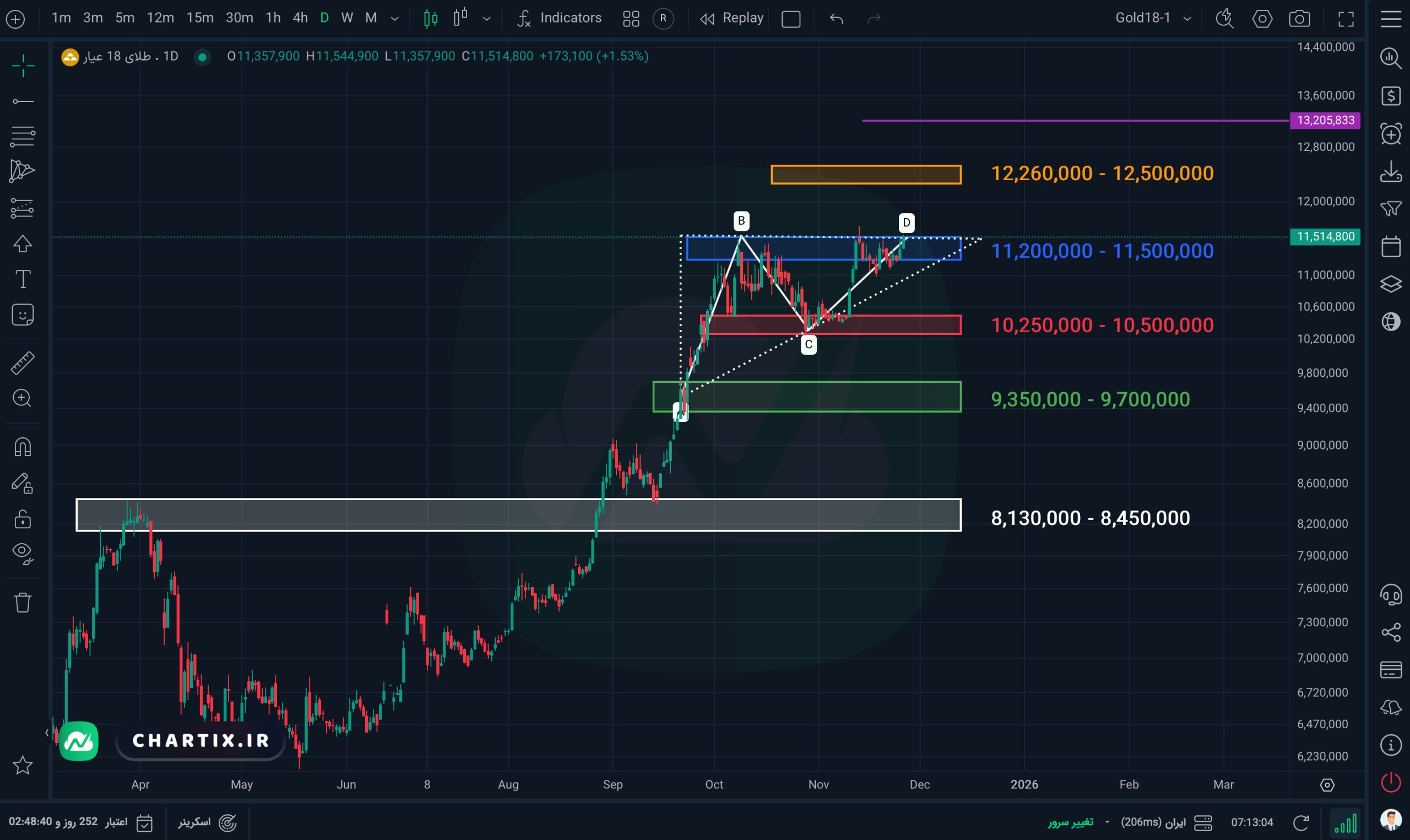 قیمت پس از برخورد به محدودهی مقاومتی 11,200,000 – 11,500,000 تومان (محدوده آبی) وارد فاز اصلاحی شد و این اصلاح تا محدودهی حمایتی 10,250,000 – 10,500,000 تومان (محدوده قرمز) ادامه داشت که حدوداً برابر با ۱۰٪ اصلاح قیمتی است.