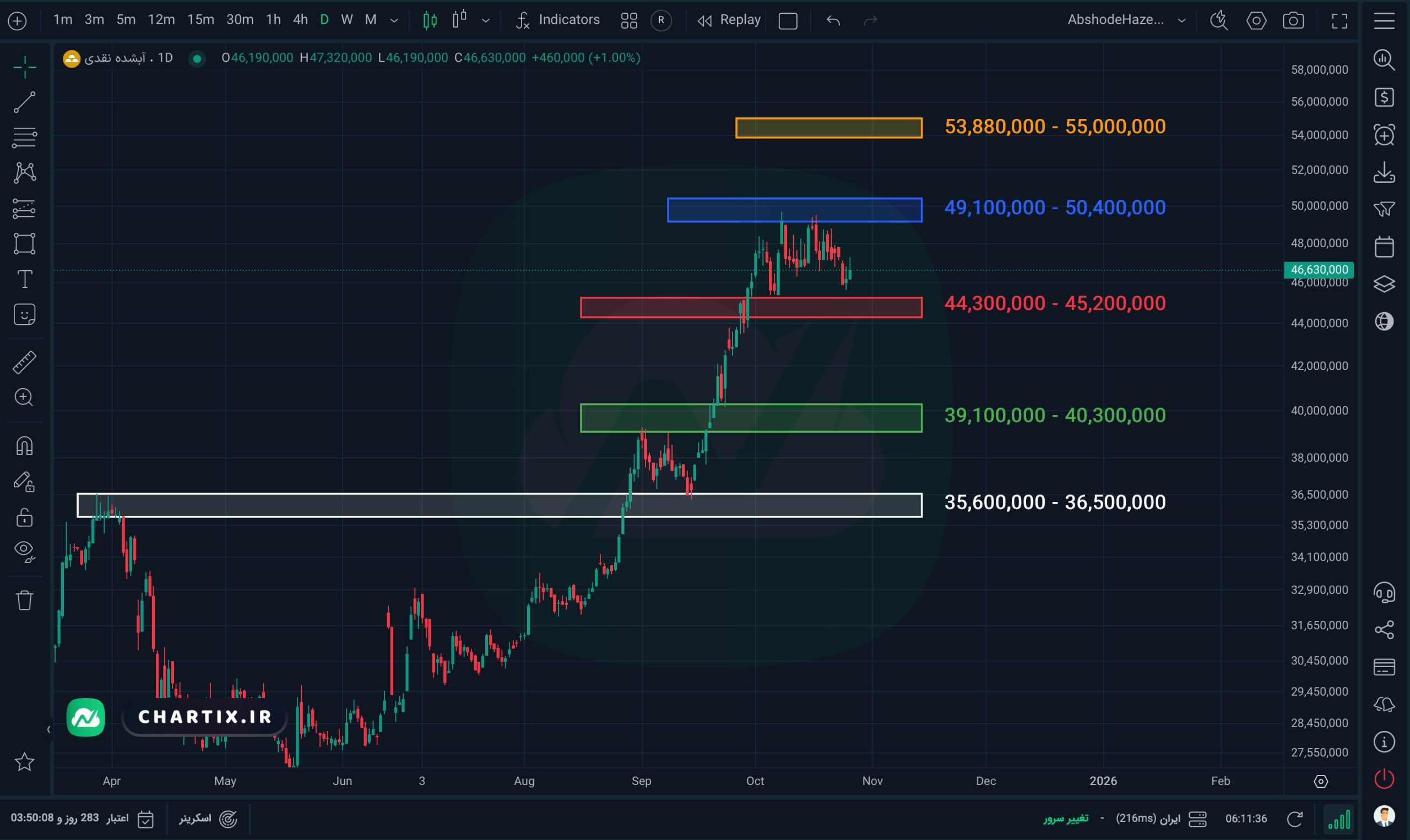 در تایم‌فریم روزانه آبشده نقدی، مشاهده می‌کنیم که قیمت در ماه‌های اخیر روند رو‌به‌رشد و صعودی از خود بر جای گذاشته که قدرت گرفته از روند افزایشی قیمت دلار و انس جهانی طلا می‌باشد. آبشده نقدی پس از شکست محدوده ۳۵,۶۰۰,۰۰۰ – ۳۶,۵۰۰,۰۰۰ تومان (محدوده سفید) به‌سمت بالا، شاهد یک پولبک قیمتی بوده‌ است که پس از تکمیل این پولبک، قیمت با شیب تندتری به روند صعودی ادامه داده است. آبشده در هفته‌های اخیر توانست سقف قیمتی جدیدی را ایجاد کند که این سقف تاریخی قیمت، در محدوده ۴۹,۱۰۰,۰۰۰ – ۵۰,۴۰۰,۰۰۰ تومان (محدوده آبی) قرار دارد. همان‌طور که در تصویر زیر مشاهده می‌کنید، قیمت پس از ایجاد این سقف، شروع به اصلاح کرده است و در حال حاضر آبشده نقدی در بازار، با قیمت ۴۶,۶۳۰,۰۰۰ تومان در حال معامله می‌باشد. طبق تحلیل گذشته آبشده نقدی که در تاریخ ۲۰ مهر از آکادمی چارتیکس منتشر شد (لینک)، انتظار اصلاح قیمت آبشده نقدی از سقف قیمتی تا محدوده ۴۴,۳۰۰,۰۰۰ – ۴۵,۲۰۰,۰۰۰ تومان (محدوده قرمز) داشتیم که در حال حاضر مشاهده می‌کنید قیمت تا این محدوده ریزش کوچکی را تجربه کرده است و شاهد حمایت مناسب از محدوده قرمز به‌سمت بالا هستیم. در حالت کلی، انتظار افزایش مجدد قیمتی از آبشده را خواهیم داشت و در صورت تثبیت قیمت در بالای محدوده آبی، انتظار رشد قیمتی تا محدوده ۵۳,۸۸۰,۰۰۰ – ۵۵,۰۰۰,۰۰۰ تومان (محدوده نارنجی) خواهیم داشت.