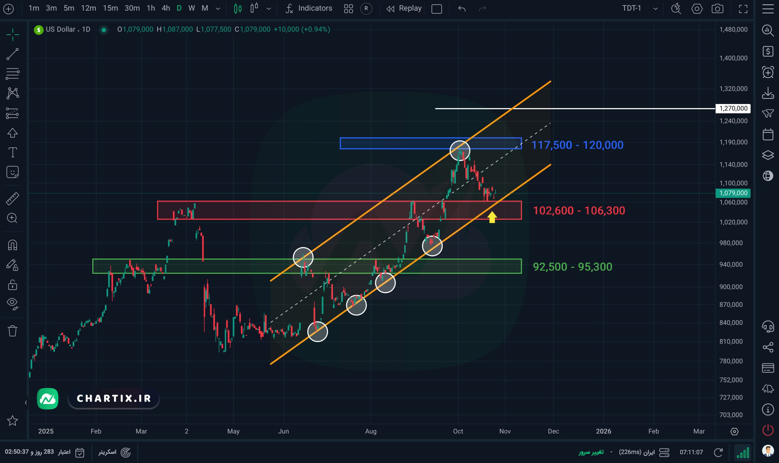 در تایم‌فریم روزانه دلار، مشاهده می‌کنیم که قیمت از ماه‌های قبل یک کانال صعودی (رنگ نارنجی) تشکیل داده است. همان‌طور که در تصویر زیر مشاهده می‌کنید، قیمت برخوردهای متعددی به سقف و کف این کانال صعودی داشته است که نشان‌دهنده قدرت بالای کانال در مهار قیمت است و از طرفی، شاهد برخورد قیمت به میدلاین کانال نیز هستیم. یکی از شیوه‌هایی که می‌توانیم از دقت کانال رسم‌شده اطمینان حاصل کنیم، دقت و تعدد برخورد قیمت به میدلاین می‌باشد که در تصویر زیر این موارد به‌خوبی قابل مشاهده است. پس از دو برخورد ناموفق که قیمت دلار به محدوده ۱۰۲,۶۰۰ – ۱۰۶,۳۰۰ تومان (محدوده قرمز) داشته، نهایتاً در هفته‌های اخیر موفق به شکست این محدوده شده است. اما اگر بخواهیم به‌صورت دقیق‌تر ری‌اکشن‌های دلار را بررسی کنیم، می‌توانیم شاهد هم‌زمانی برخورد قیمت به سقف کانال و محدوده استاتیکی ۱۱۷,۵۰۰ – ۱۲۰,۰۰۰ تومان (محدوده آبی) باشیم که همین امر باعث ایجاد اصلاح قیمتی در روند صعودی دلار شده است. طبق تحلیل ۲۰ مهر که در آکادمی چارتیکس منتشر شده است (لینک)، مشاهده می‌کنیم که قیمت توانسته به کف کانال برسد که این اصلاح را می‌توان پولبکی به سقف تاریخی قبلی دلار که در محدوده قرمز قرار داشته است، بدانیم. این اصلاح صورت‌گرفته می‌تواند آغاز حرکت و روندی صعودی برای قیمت دلار باشد. تارگت‌هایی که می‌توان برای حرکت صعودی بعدی دلار در نظر گرفت، برای گام اول محدوده آبی و برای گام دوم حوالی قیمت ۱۲۷,۰۰۰ تومان (خط افقی سفید) می‌باشد.