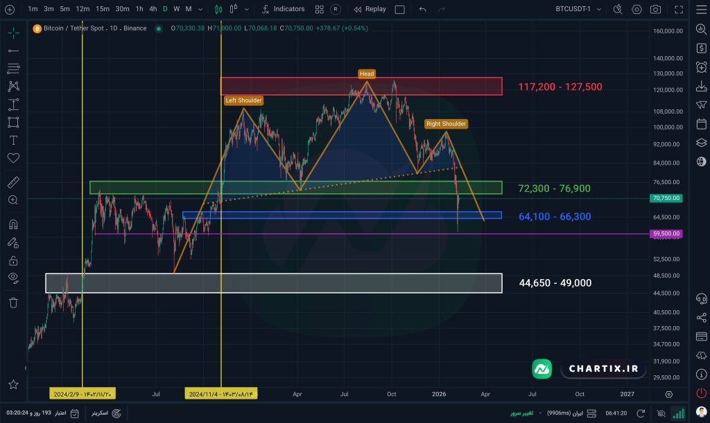 همانطور که در تصویر زیر مشخص است، بیتکوین توانسته در بلندمدت الگوی سر و شانه تشکیل دهد که تشکیل چنین الگویی در چنین تایمفریمی زمانبر و بسیار معتبر میباشد. پس از شکست خط گردن این الگو که در محدوده قرمز قرار داشته توسط قیمت، شاهد ریزش بیتکوین هستیم که توانسته محدوده رنج بلندمدت که کف آن ناحیه سبز بوده را نیز شکست دهد. قیمت پس از برخورد به ناحیه 59,500 دلار (خط افقی بنفش) که در گذشته شاهد ریاکشنهای قیمتی به این ناحیه بودهایم، توانسته حمایت خوبی دریافت کند؛ اما انتظار میرود این حمایت تنها پولبکی به سطح محدوده سبز که بهتازگی شکسته شده است باشد و در ادامه انتظار ریزش قیمت بیتکوین را خواهیم داشت. تارگتهایی که برای این ریزش در آینده خواهیم داشت، در گام اول ناحیه بنفش خواهد بود که در روزهای گذشته نیز شاهد برخورد قیمت به آن بودهایم و در گام دوم محدوده سفید که در گذشته کف مهم قیمتی بوده است.