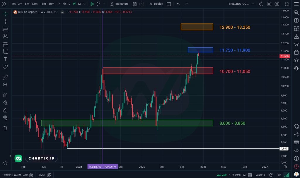 در تایمفریم هفتگی قرارداد فیوچرز مس (CFD Copper)، مشاهده میکنیم پس از سقف قیمتی (ATH) که در اواخر اردیبهشت ۱۴۰۳ در محدوده 10,700 تا 11,050 دلار (محدوده قرمز) ثبت شد، قیمت وارد روند نزولی شده و این روند تا محدوده 8,600 تا 8,850 دلار (محدوده سبز) ادامه یافته است.