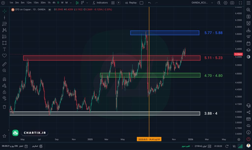 قیمت در تیرماه سال جاری توانسته محدوده قرمز را به سمت بالا بشکند و سقف تاریخی جدیدی را در محدوده 5.77 تا 5.88 دلار (محدوده آبی) ثبت کند. پس از این سقف جدید، قیمت حرکتی پرقدرت به سمت پایین داشته و طی چند روز ریزش شدیدی را تجربه کرده است. این حرکات شارپ، بهدلیل نقدینگی محدود بازار مس ایجاد میشوند و معمولاً تحت تأثیر معاملات بزرگ قرار دارند.