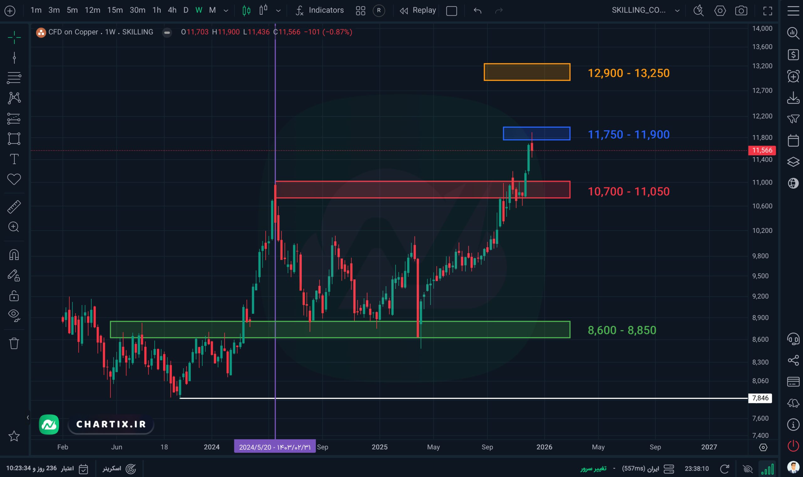 تارگتی که میتوان برای معاملات CFD مس در نظر گرفت و احتمال تاچ شدن آن در هفتههای آتی وجود دارد، محدوده 12,900 تا 13,250 دلار (محدوده نارنجی) خواهد بود.