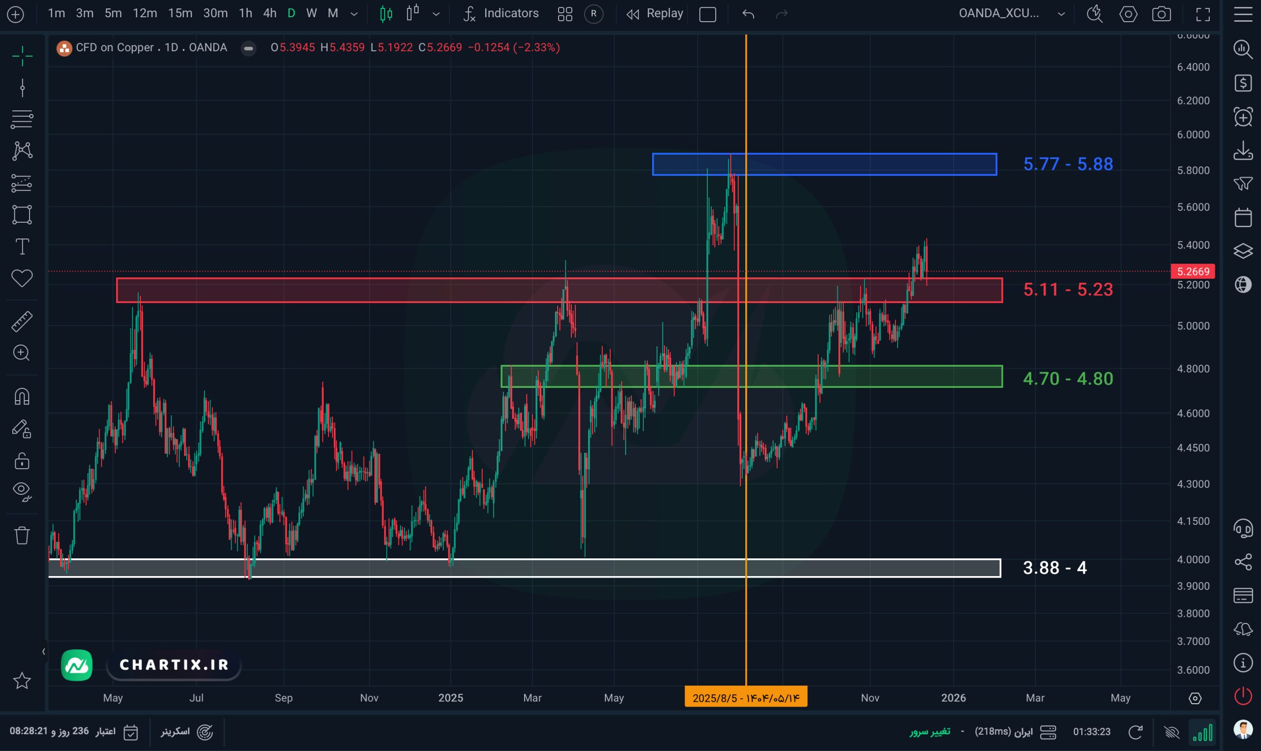 قیمت در تیرماه سال جاری توانسته محدوده قرمز را به سمت بالا بشکند و سقف تاریخی جدیدی را در محدوده 5.77 تا 5.88 دلار (محدوده آبی) ثبت کند. پس از این سقف جدید، قیمت حرکتی پرقدرت به سمت پایین داشته و طی چند روز ریزش شدیدی را تجربه کرده است. این حرکات شارپ، بهدلیل نقدینگی محدود بازار مس ایجاد میشوند و معمولاً تحت تأثیر معاملات بزرگ قرار دارند.