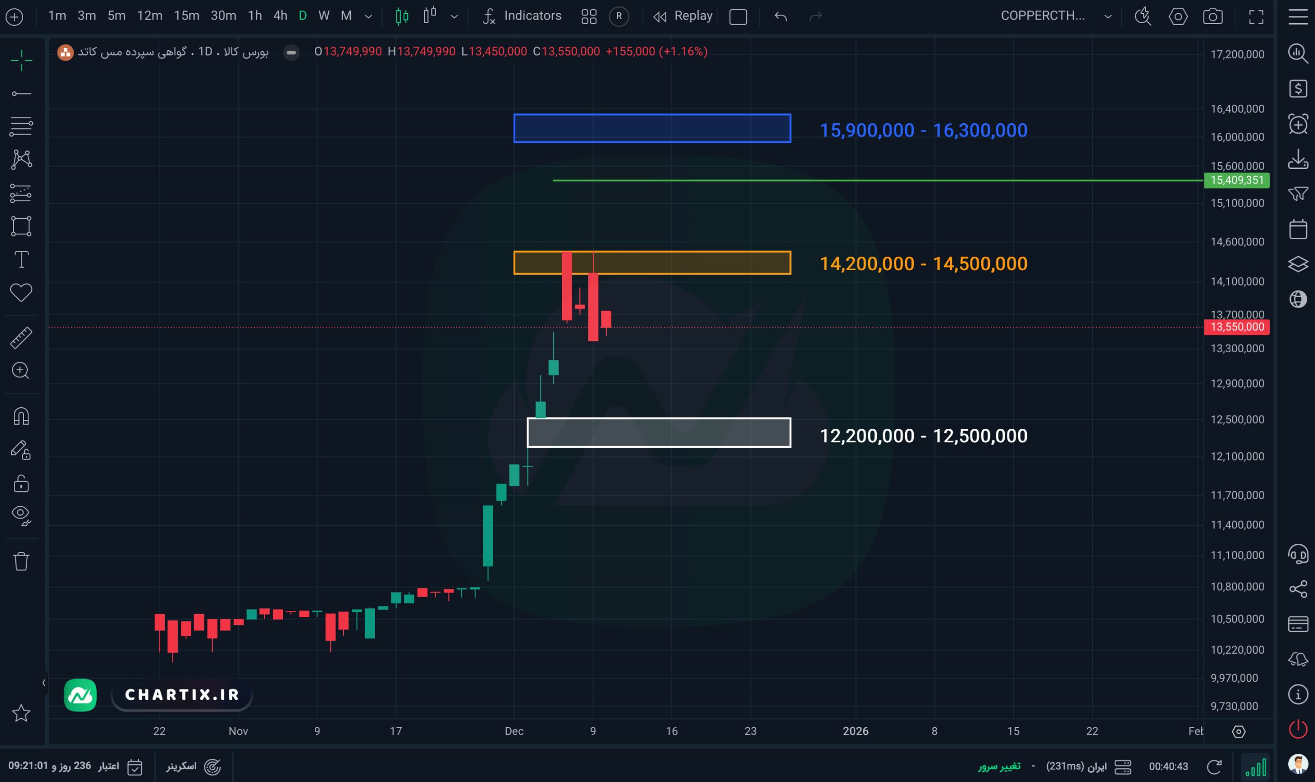 با توجه به معامله شدن قرارداد آتی سپرده مس کاتد با سررسید اسفند ۱۴۰۴ در حوالی قیمت 15,400,000 تومان (خط افقی سبز)، میتوان انتظار داشت که قیمت تا آن زمان به این محدوده برسد. اما تارگت نهایی که بر اساس دادههای تحلیل تکنیکال میتوان در نظر گرفت، محدوده 15,900,000 تا 16,300,000 تومان (محدوده آبی) خواهد بود.