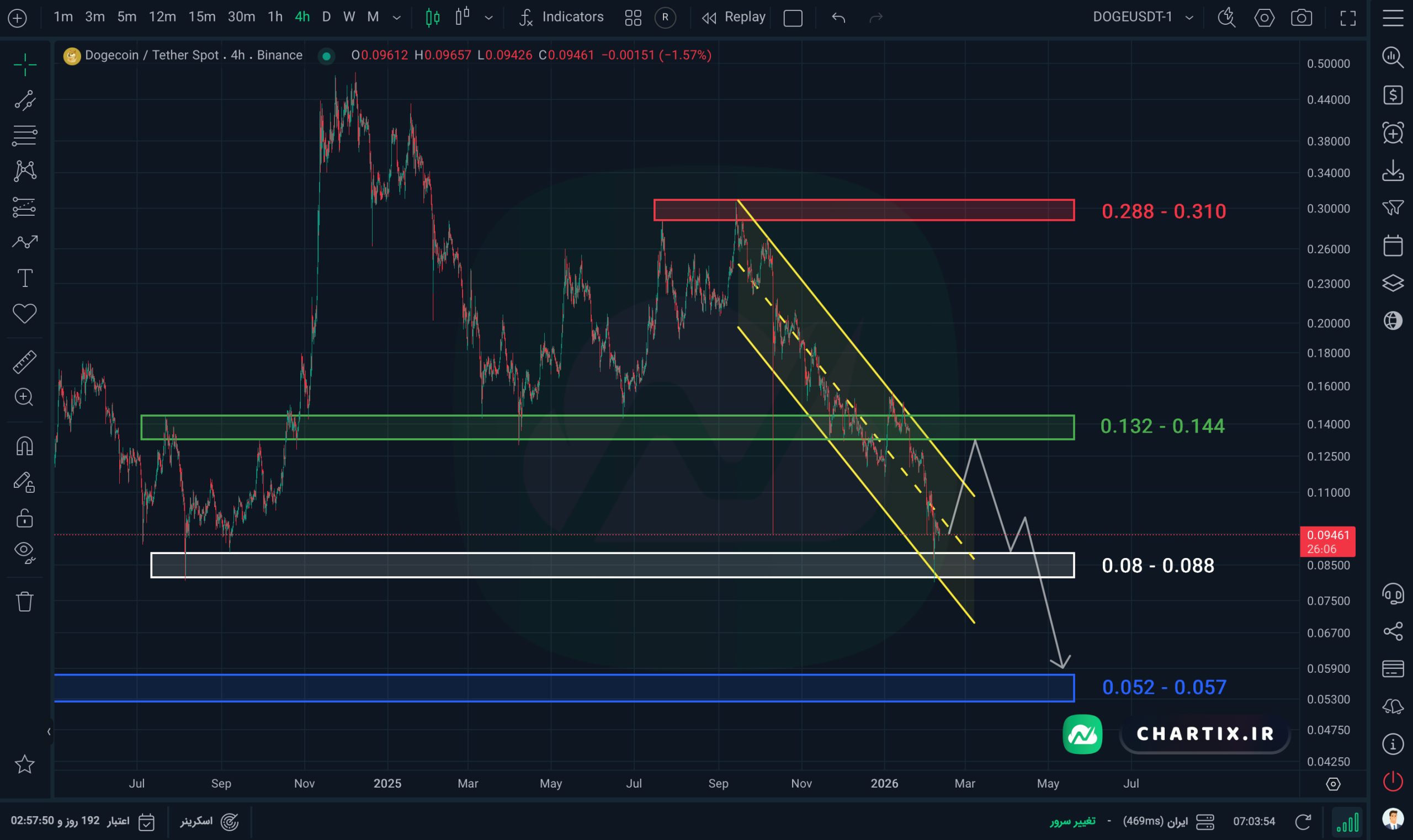 در طول حرکت در این کانال به سمت پایین، قیمت بارها به سقف و کف کانال برخورد کرده و در حال حاضر دوج‌کوین در حوالی قیمت 0.094 دلار و در نزدیکی محدوده حمایتی 0.08 – 0.088 دلار (محدوده سفید) معامله می‌شود. همان‌طور که در تصویر زیر مشاهده می‌کنید، پیش‌بینی می‌شود قیمت بتواند سقف کانال صعودی را بشکند، اما نتواند محدوده سبز را به سمت بالا شکست دهد و در صورت ناتوانی در شکست این محدوده، مجدداً ریزش را تجربه کند. در صورتی که این اتفاق رخ دهد، تارگتی که می‌توانیم برای ادامه روند نزولی دوج‌کوین در نظر بگیریم، محدوده 0.052 – 0.057 دلار (محدوده آبی) خواهد بود.