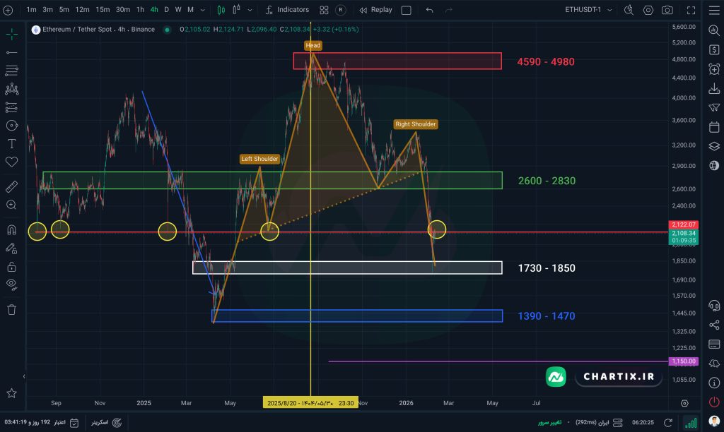 اما در ادامه و پس از حمایت نسبی که در محدوده سبز از قیمت شده است، شاهد شکست این محدوده بوده‌ایم و در حال حاضر اتریوم در حوالی محدوده 1730 – 1850 دلار (محدوده سفید) در حال معامله است. اگر به ساختار تشکیل‌شده و الگوی نمودار تکنیکالی اتریوم نگاهی بیندازیم، شاهد تشکیل الگوی سر و شانه خواهیم بود که پس از شکستن خط گردن، که در محدوده سبز قرار داشته، به سمت پایین حرکت کرده است. در ادامه حرکت اتریوم برای هفته‌های آتی، انتظار شکست محدوده سفید و ریزش قیمت را در گام اول تا محدوده آبی و در گام دوم تا محدوده 1150 دلار (خط افقی بنفش) خواهیم داشت.