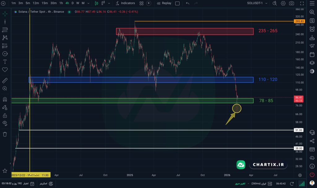 اما در هفته‌های اخیر، شاهد شکست محدوده آبی به سمت پایین هستیم که قیمت توانسته خود را در زیر این محدوده تثبیت کند و در ادامه، سولانا تا محدوده 78 – 85 دلار (محدوده سبز) کاهش قیمت را تجربه کرده است. در حال حاضر سولانا با قیمت 86 دلار معامله می‌شود که در نزدیکی محدوده سبز قرار دارد. با توجه به احتمال شکسته شدن محدوده سبز به سمت پایین، روند قیمتی را در ادامه نزولی می‌بینیم و تارگت‌هایی که برای سولانا در تایم‌فریم ۴ ساعته می‌توانیم متصور باشیم، به‌ترتیب محدوده 51 دلار در گام اول و محدوده 38 دلار (خطوط افقی سفید) در گام دوم خواهد بود.