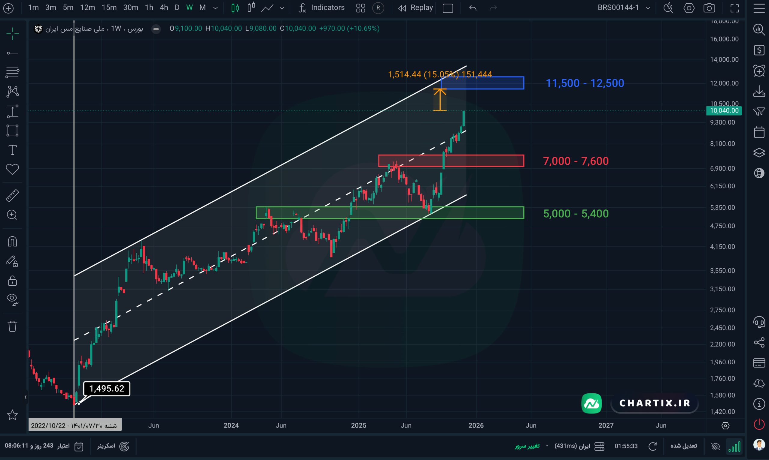 اما در هفتههای اخیر و با توجه به موج جدید افزایش قیمت جهانی مس، فملی توانسته با کندلهای مومنتوم صعودی، محدوده قرمز را بهسمت بالا بشکند و از آن عبور کند. در حال حاضر فملی در حوالی 10,000 ریال معامله میشود و توانسته از میدلاین کانال عبور کند. تارگت مورد انتظار برای روزهای آینده محدوده 11,500 – 12,500 ریال (محدوده آبی) است که در سقف کانال قرار دارد و فاصله آن با قیمت لحظهای حدود 15% است.