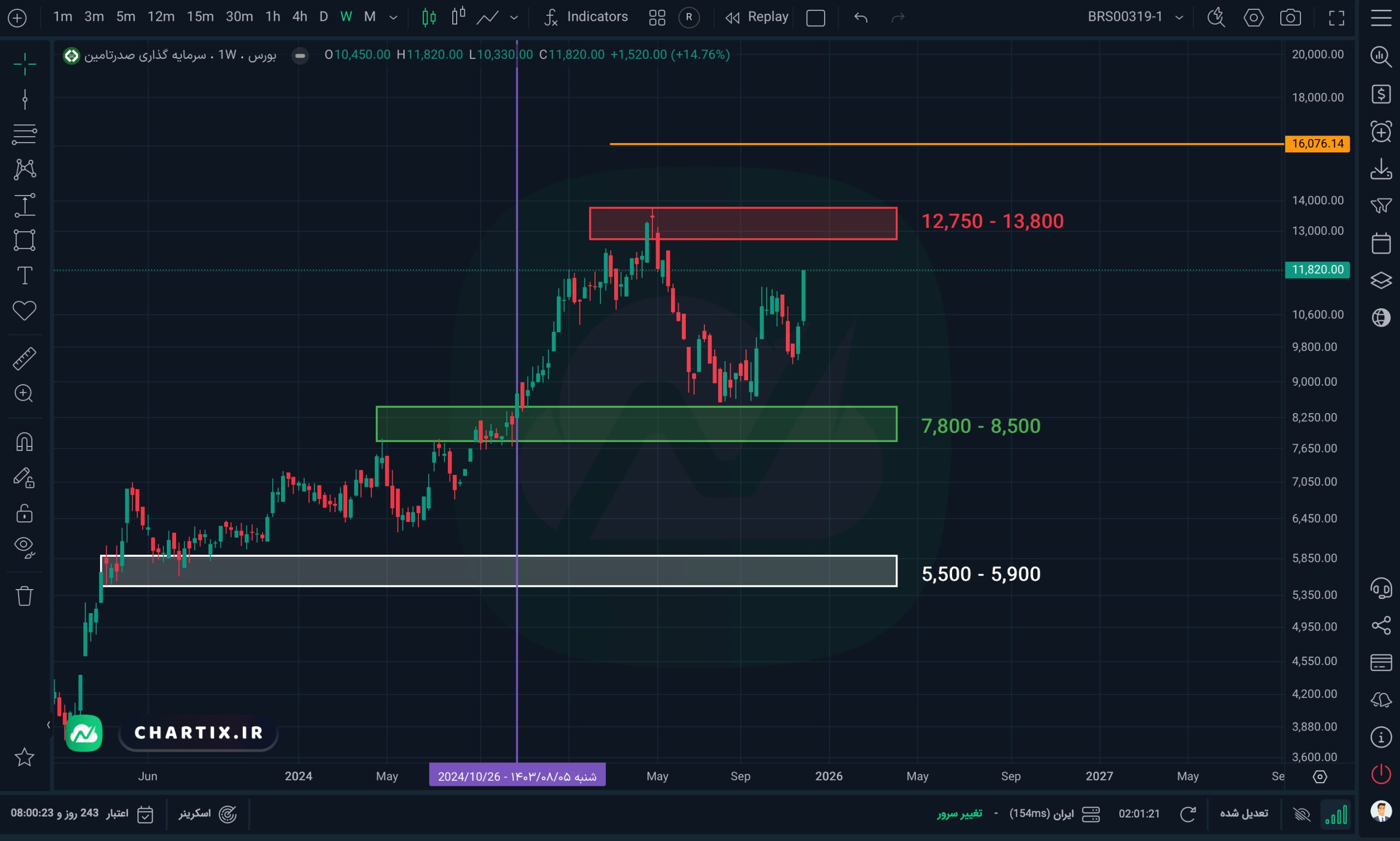 گام دوم: در صورت تثبیت بالای محدوده قرمز، رسیدن به حوالی 16,000 ریال (خط افقی نارنجی)