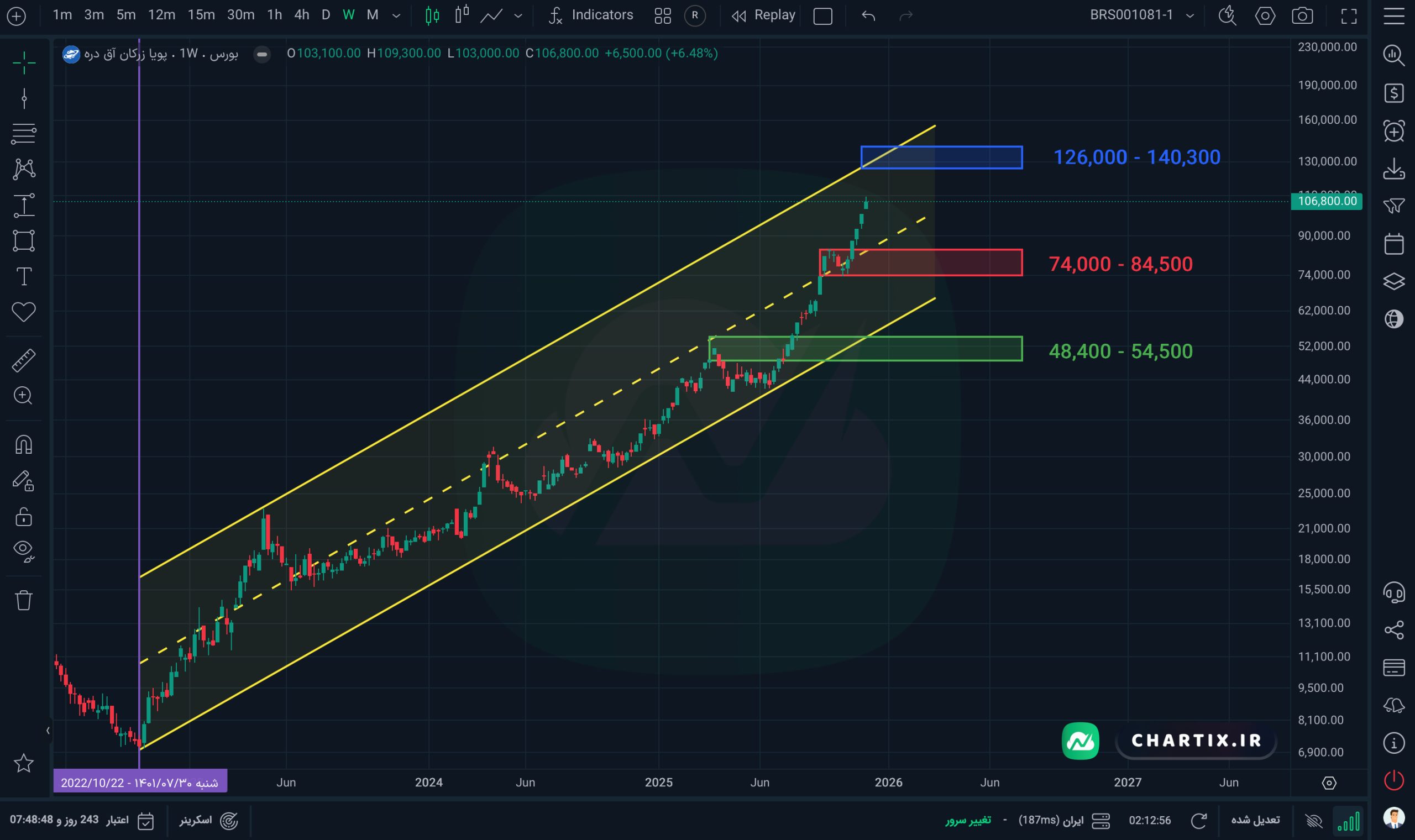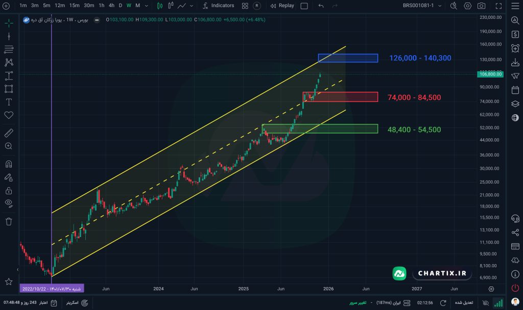 یکی از پیوتهای مهم ماههای اخیر، محدوده 48,400 – 54,500 ریال (محدوده سبز) بوده که در برخورد اول باعث اصلاح و در برخورد دوم باعث شکست سطح شده است. اما در هفتههای اخیر شاهد ایجاد یک گره معاملاتی در محدوده 74,000 – 84,500 ریال (محدوده قرمز) بودهایم که در میدلاین کانال قرار داشته و قیمت توانسته با کندلهای مومنتوم از آن عبور کند و پس از دو سال دوباره بالای میدلاین قرار گیرد؛ موضوعی که نشاندهنده قدرت بالای روند صعودی است.