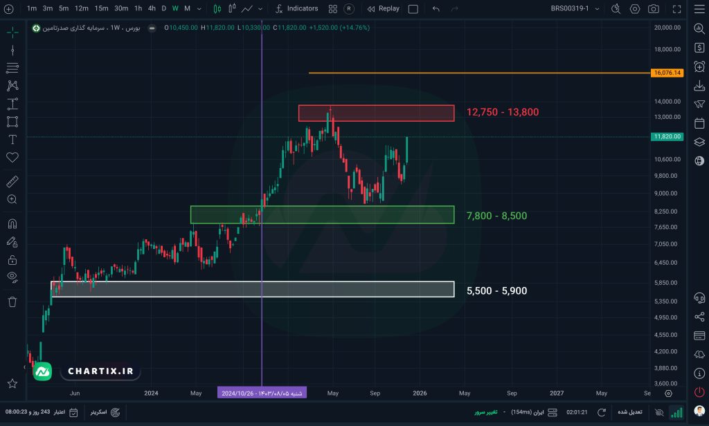 در حال حاضر هر سهم تاصیکو در حوالی 11,800 ریال معامله میشود و با توجه به کندل پرقدرت صعودی هفته گذشته، میتوان انتظار ادامه صف خرید در این هفته را داشت. تارگتهای قابلانتظار: