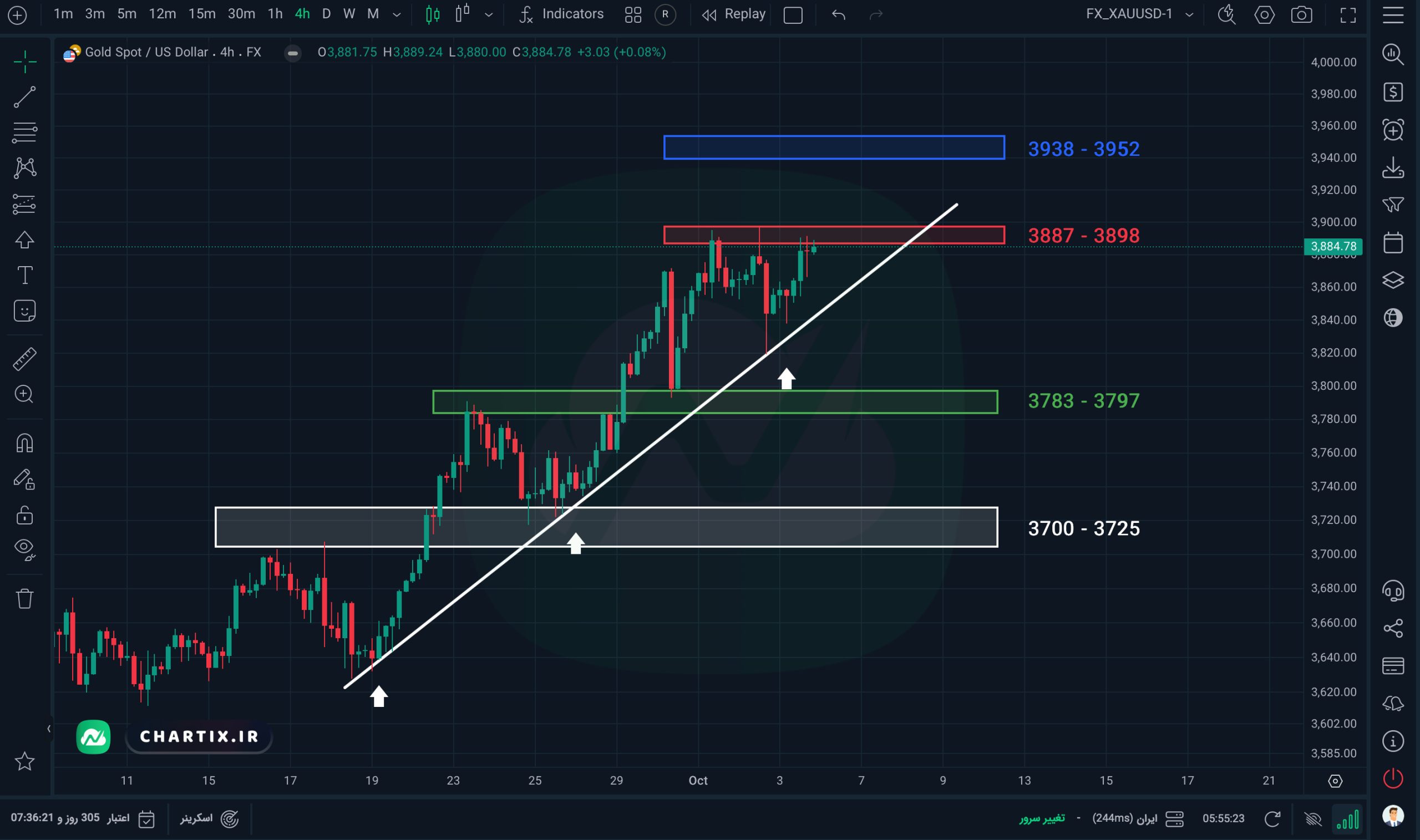 در تایمفریم ۴ ساعته انس جهانی طلا (XAUUSD)، مشاهده میکنیم که در هفتههای اخیر روند صعودی پُرقدرتی را شاهد بودهایم که این روند صعودی پُرقدرت در روزهای اخیر توانسته سقف تاریخی جدیدی را در محدودهی 3887 – 3898 دلار (محدودهی قرمز) ایجاد کند. میتوانیم قدرت روند صعودی را نیز از روی کندلهای مومنتوم سبزرنگ مشاهده کنیم که رشدهای پیوسته و اصلاح قیمتی نسبتاً کمتری داشتهاند و بهراحتی میتوان سقف و کفهای قبلی را تشخیص داد. همانطور که در تصویر زیر مشاهده میکنید، در دو هفتهی اخیر انس طلا توانسته خط روند صعودی تشکیل دهد که قیمت سه برخورد موفق به این خط روند داشته است، که نشاندهندهی اعتبار بالای این خط روند در هدایت قیمت به سمت بالا است.