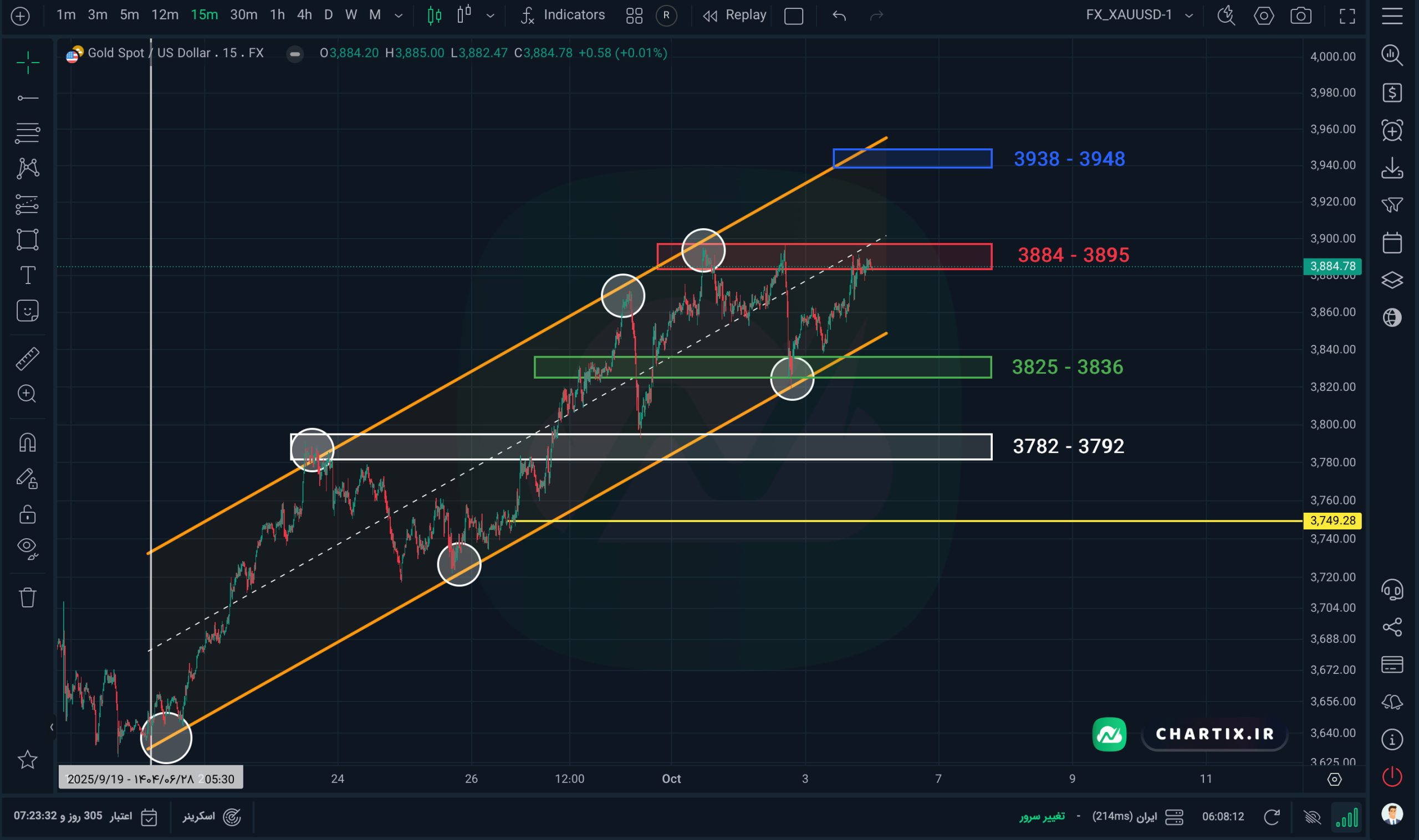 در حال حاضر قیمت درگیر محدودهی مقاومتی 3884 – 3895 دلار (محدودهی قرمز) میباشد و در حوالی قیمت 3884 دلار معامله میشود. زمانی میتوانیم بهصورت قطعی بگوییم انس طلا وارد روند نزولی شده است که قیمت بتواند کف کانال نزولی را به سمت پایین شکسته و خود را تثبیت کند. تارگتهایی که میتوانیم برای تایمفریم ۱۵ دقیقه برای این هفته در نظر بگیریم در گام اول، محدودهی 3825 – 3836 دلار (محدودهی سبز) و در صورت ادامهی ریزش، تارگت دوم ما در محدودهی 3782 – 3792 دلار (محدودهی سفید) فعال خواهد شد.