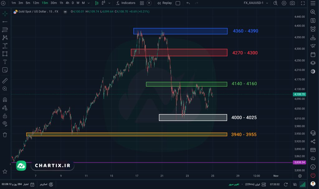 اما در تایم‌فریم ۱۵ دقیقه اونس جهانی طلا (XAUUSD) مشاهده می‌کنیم که قیمت در ریزش‌های دوهفته اخیر به‌صورت شارپ عمل کرده و کندل‌های مومنتوم نزولی ایجاد کرده است. در حال حاضر قیمت در نزدیکی محدوده ۴۱۴۰ تا ۴۱۶۰ (محدوده سبز) قرار گرفته و در چند روز اخیر بین محدوده سبز و محدوده ۴۰۰۰ تا ۴۰۲۵ (محدوده سفید) در حال نوسان بوده و روند رِنجی ایجاد کرده است.