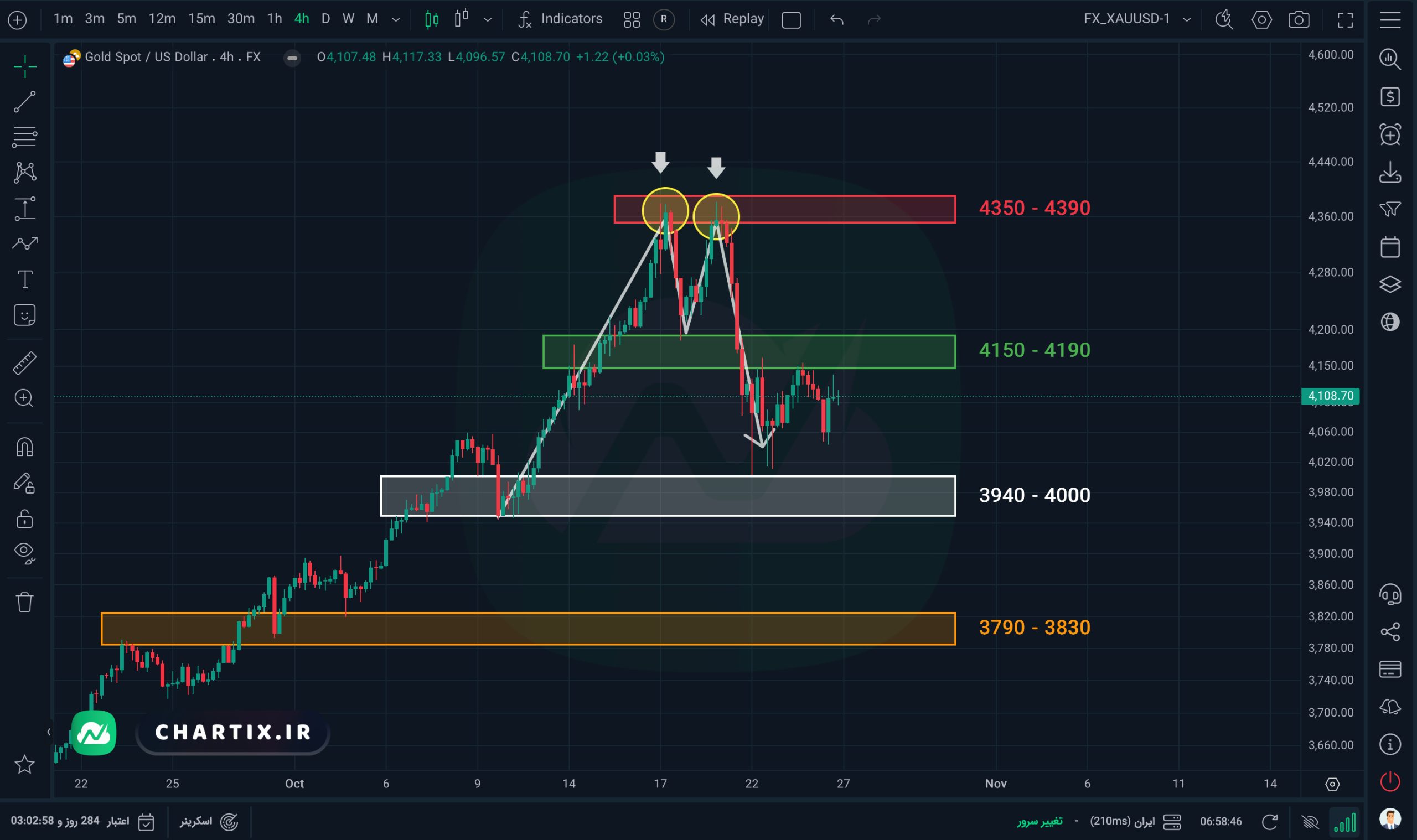 در تایم‌فریم ۴ ساعته اونس جهانی طلا (XAUUSD) مشاهده می‌کنیم که قیمت در هفته‌های اخیر دارای روند صعودی پرقدرتی بوده است. این روند پرقدرت صعودی از اوایل شهریور‌ماه آغاز شده و تا هفته‌های اخیر که اونس جهانی توانست سقف تاریخی جدیدی در محدوده ۴۳۵۰ تا ۴۳۹۰ (محدوده قرمز) ایجاد کند، ادامه داشته است. در این روند صعودی شاهد افزایش بیش از ۳۳ درصدی در اونس طلا بوده‌ایم.