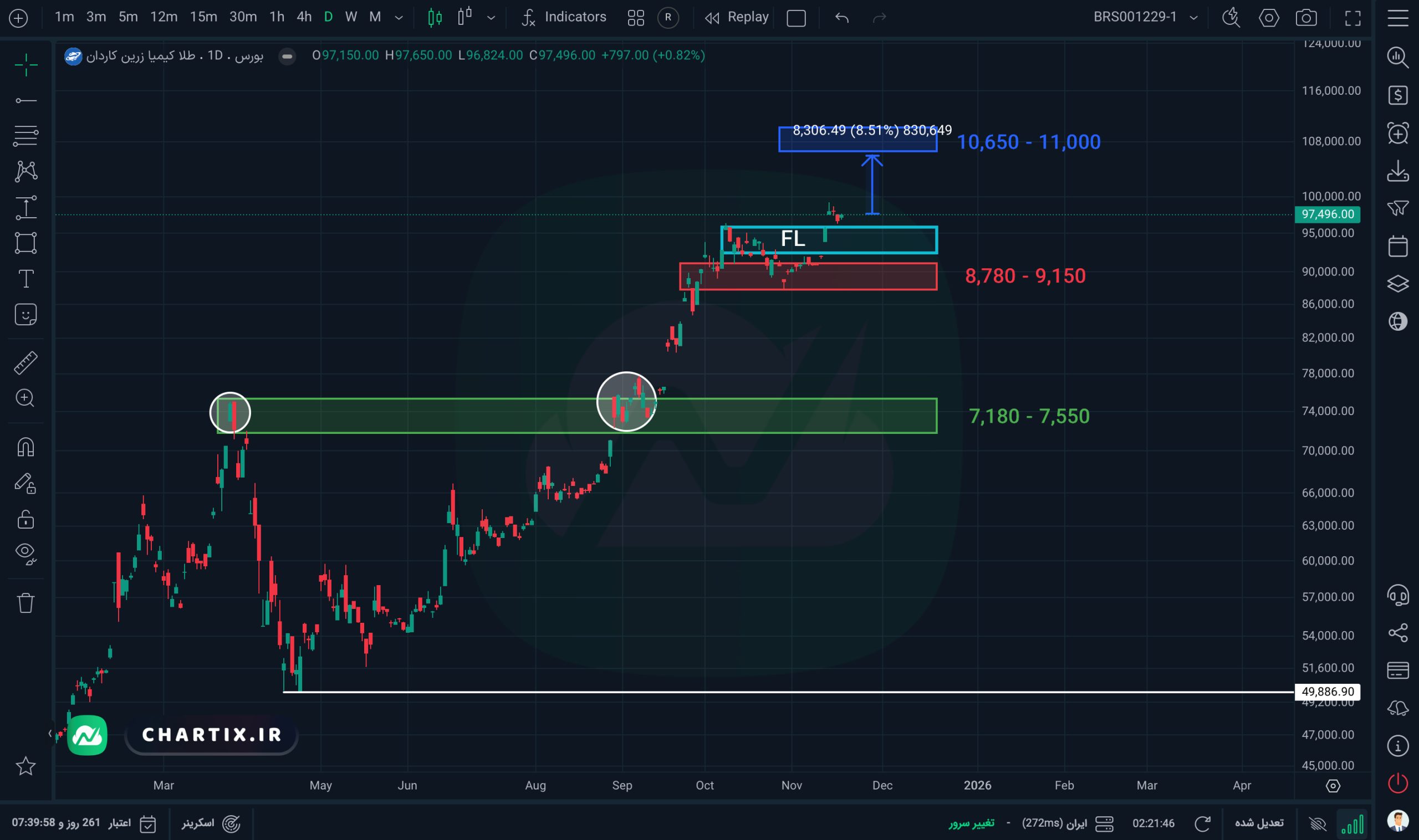 در ماه‌های اخیر قیمت محدوده مقاومتی جدیدی در عدد ۸,۷۸۰ – ۹,۱۵۰ تومان (محدوده قرمز) ایجاد کرده و درگیر شکست این محدوده بوده است. پس از برخوردهای متعدد قیمت به این ناحیه، اوردرهای فروش موجود برداشته شده و بازار توانسته این محدوده را به سمت بالا بشکند. نتیجه این شکست که با کندل‌های مومنتوم صورت گرفته، در ادامه با ایجاد ساختار بیس (Base) توانسته الگوی فلگ لیمیت (FL) را اجرا کند. توجه داشته باشید قیمت پس از عبور از زون فلگ لیمیت (FL Zone) در اولین برخورد انتظار ایجاد پولبک و ادامه حرکت را دارد و این ساختار جزو ساختارهای ادامه‌دهنده روند می‌باشد.