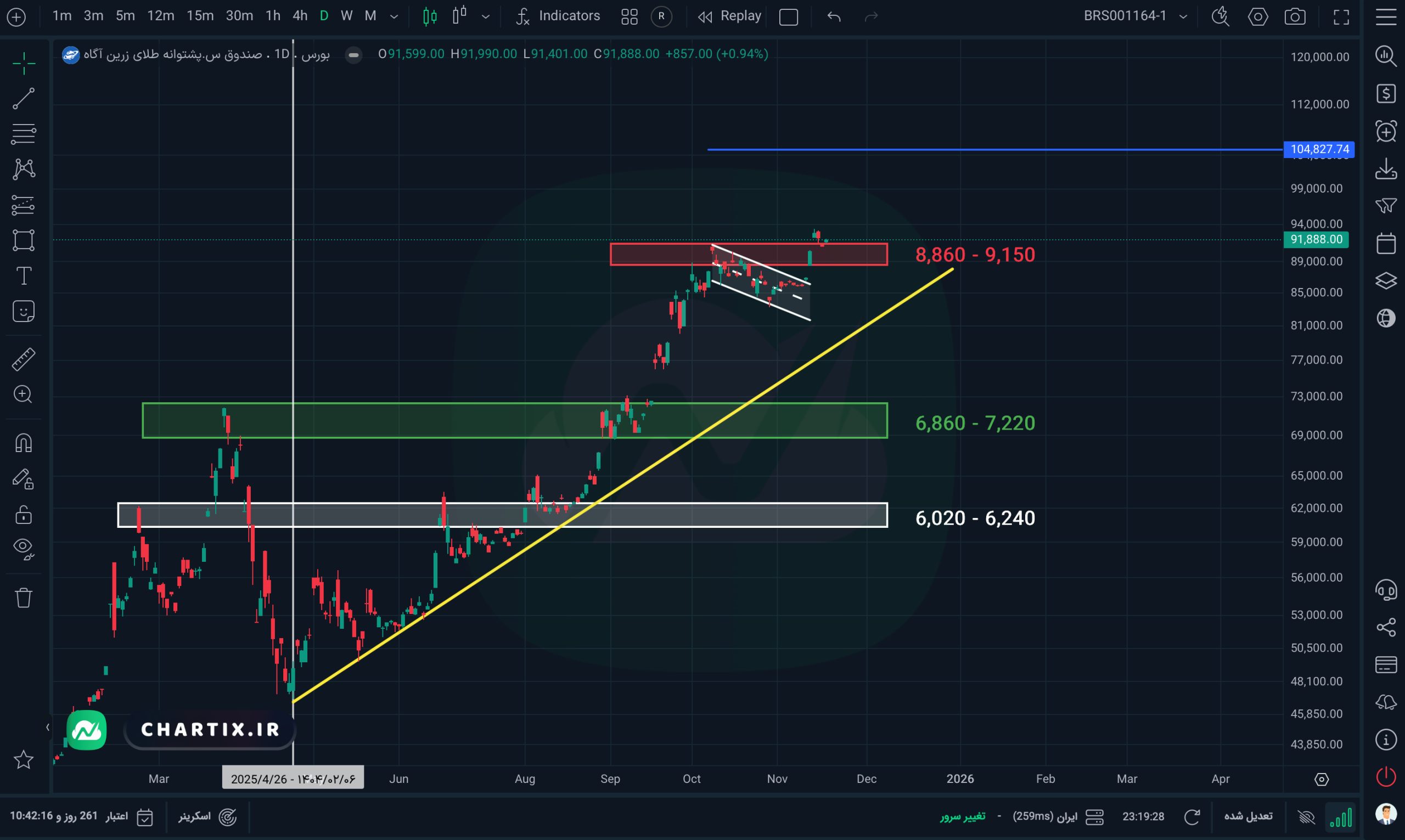 قیمت پس از تغییر فاز نزولی به صعودی، توانسته خط روند تشکیل دهد. همان‌طور که در تصویر زیر مشاهده می‌کنیم قیمت در طول مسیر چندین برخورد به این خط روند داشته که در نتیجه موفق به شکست آن نشده است. به طور کلی افزایش قیمت صندوق‌های طلا در ماه‌های اخیر تحت دو عامل اصلی بوده که مهم‌ترین آن انس جهانی طلا و عامل دیگر قیمت دلار در بازار می‌باشد. در روزهای گذشته تحلیل جامعی از این دو دارایی به صورت کامل در آکادمی چارتیکس قرار گرفته است و با مراجعه به صفحه این تحلیل‌ها می‌توانید پیش‌بینی و تارگت‌های مطرح‌شده را مشاهده کنید. (تحلیل اونس جهانی طلا و تحلیل دلار)