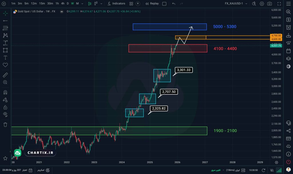 با توجه به سیاستگذاریهای فدرال رزرو و اتفاقاتی که در نقاط مختلف جهان در حال رخ دادن است، انتظار میرود انس جهانی طلا پتانسیل شکست این محدوده به سمت بالا و عبور از سقف تاریخی خود را در هفتههای آتی داشته باشد. با آغاز سال نو میلادی ۲۰۲۶، میتوانیم شاهد ثبت سقفهای تاریخی جدید (ATH) باشیم. میزان قدرت و تداوم این شکست به نحوه عبور قیمت از محدوده قرمز بستگی دارد و در صورتی که این شکست با کندلهای مومنتوم همراه باشد، انتظار رشد قیمت تا محدوده ۴۶۰۰ تا ۴۷۰۰ دلار (محدوده نارنجی) را خواهیم داشت. پس از آن، احتمال پولبک به محدوده قرمز وجود دارد و سپس با ورود اوردرهای جدید بانکی، حرکت قیمت به سمت هدف اصلی یعنی محدوده ۵۰۰۰ تا ۵۳۰۰ دلار (محدوده آبی) محتمل خواهد بود. مسیر صعودی سال ۲۰۲۶ میتواند تا همین محدوده ادامه داشته باشد و انتظار رشد فراتر از آن با قدرت فعلی بازار چندان منطقی نیست.