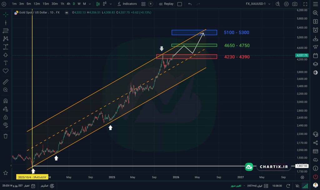 در هفتههای آینده انتظار میرود قیمت بتواند محدوده قرمز را به سمت بالا بشکند. البته باید توجه داشت که در اواخر سال میلادی و هفتههای ابتدایی سال جدید، بازارها با حجم نقدینگی پایینتری فعالیت میکنند، اما پس از آن شاهد شکلگیری روندهای جدید و افزایش قدرت معاملات خواهیم بود. سناریوی مورد انتظار برای تایمفریم روزانه در سال ۲۰۲۶، مشابه تایمفریم هفتگی است؛ یعنی شکست محدوده قرمز به سمت بالا، رشد قیمت تا محدوده ۴۶۵۰ تا ۴۷۵۰ دلار (محدوده سبز)، سپس اصلاح قیمتی تا محدوده قرمز که سقف تاریخی قبلی محسوب میشود و در نهایت، ادامه حرکت صعودی تا محدوده ۵۱۰۰ تا ۵۳۰۰ دلار (محدوده آبی). لازم به ذکر است که در این محدوده آبی، به دلیل همزمانی برخورد قیمت با سقف داینامیکی کانال و مقاومت استاتیکی، احتمال واکنشهای قوی قیمتی وجود دارد.