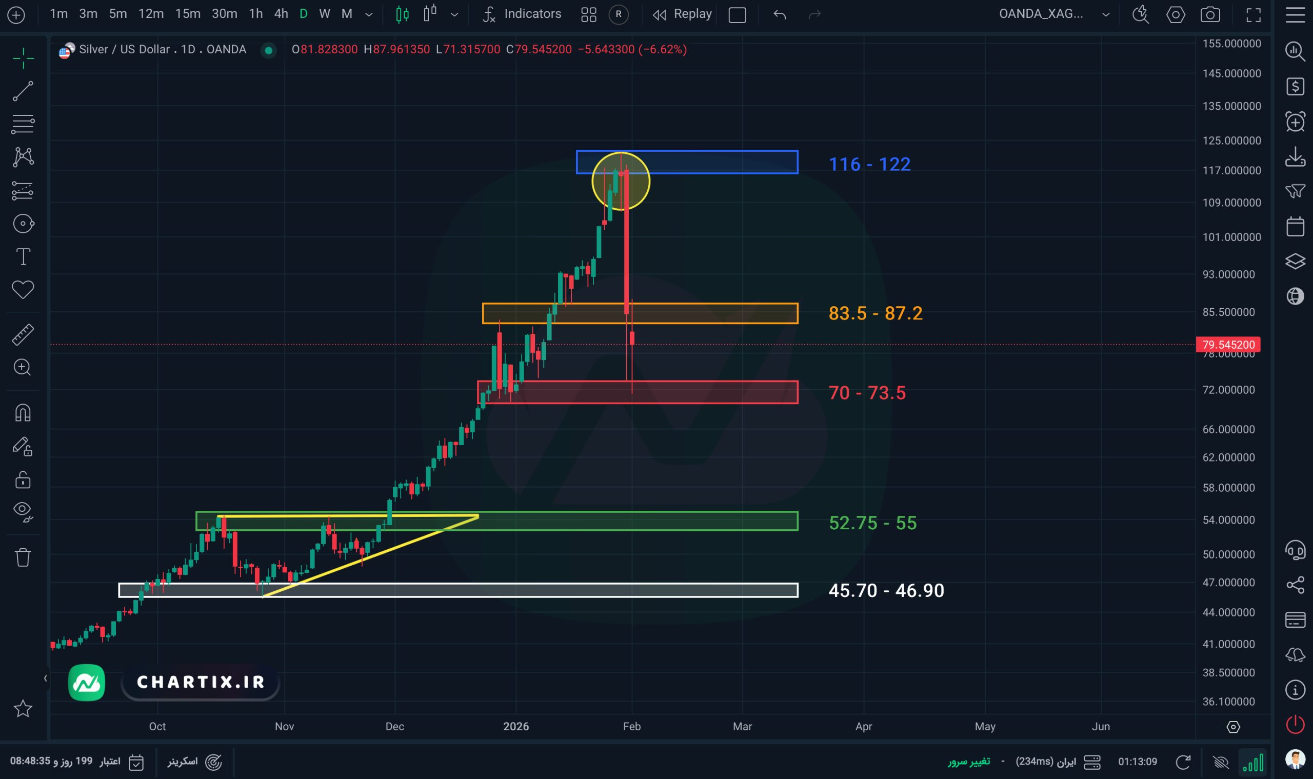 در ادامه حرکت صعودی، قیمت توانست خود را به سطح مقاومتی 83.5 تا 87.2 دلار (محدوده نارنجی) برساند و سپس برای مدت کوتاهی در حوالی این محدوده وارد فاز رنج شود. در هفته گذشته، شاهد ثبت رکورد قیمتی جدیدی در انس نقره بودیم که منجر به ایجاد سقف تاریخی جدید (ATH) در محدوده 116 تا 122 دلار (محدوده آبی) شد. پس از شکلگیری این ناحیه، از یکسو شاهد تشکیل کندل دوجی بودیم و از سوی دیگر، اخباری پیرامون انجام مذاکرات میان ایران و آمریکا منتشر شد که باعث کاهش قابلتوجه فشار خرید و افزایش فشار فروش گردید. در نتیجه، در روز جمعه شاهد ریزش سنگین قیمت نقره بودیم. این ریزش تا محدوده حمایتی 70 تا 73.5 دلار (محدوده قرمز) ادامه پیدا کرد، اما در این ناحیه با حمایت مناسبی مواجه شد.