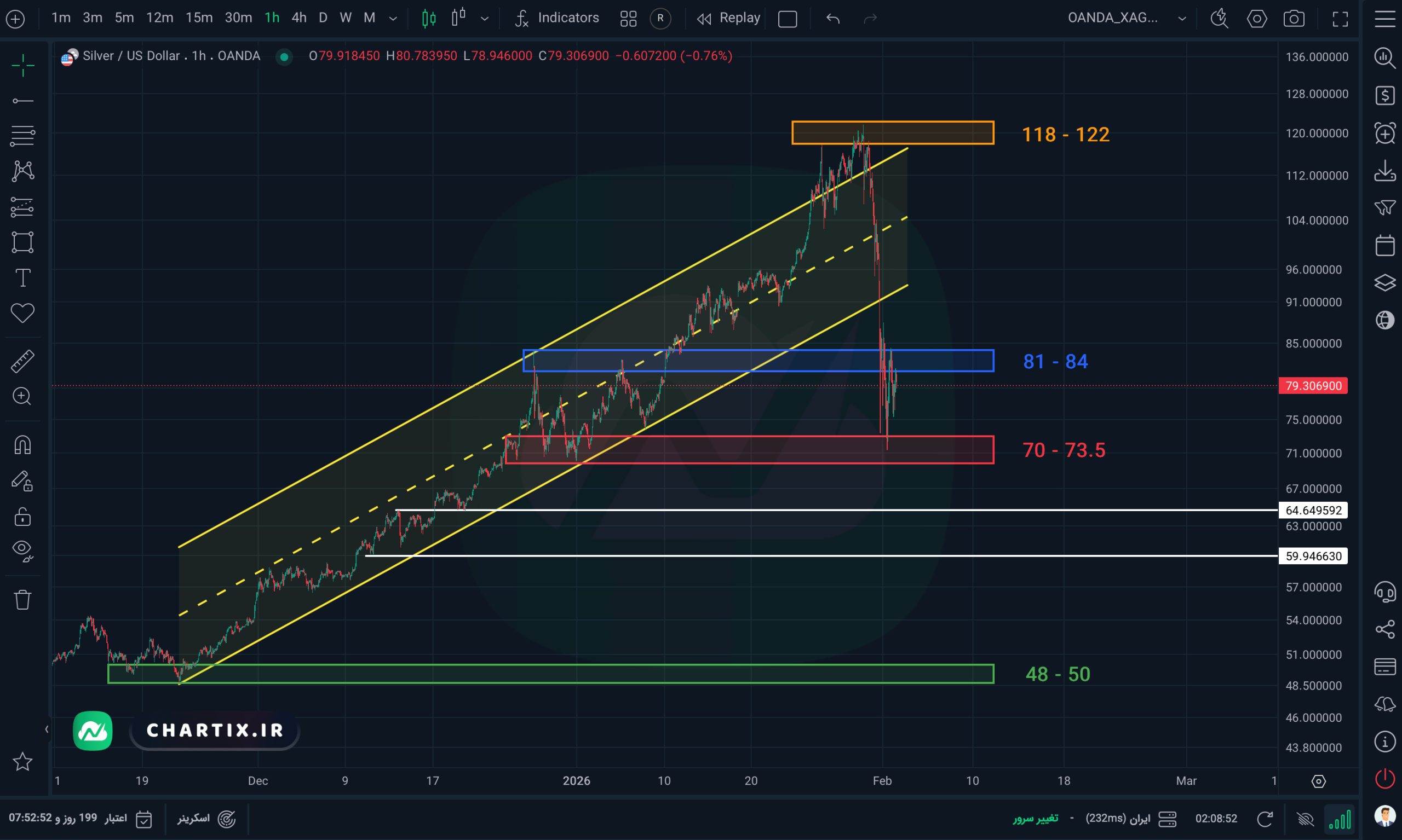 در ادامه، شاهد ریزش سنگین قیمت تا محدوده 70 تا 73.5 دلار (محدوده قرمز) بودیم که این ناحیه مجدداً حمایت مناسبی از قیمت انجام داد. در حال حاضر، نقره در محدودهای بسیار مهم قرار گرفته و میتوان برای آن دو سناریوی حیاتی در نظر گرفت. سناریوی اول که احتمال وقوع آن بیشتر است، شکست محدوده آبی به سمت بالا میباشد؛ حرکتی که در گذشته نیز سابقه آن را داشتهایم و در این صورت، تارگتهای قیمتی میتوانند کف کانال صعودی و سپس سقف کانال باشند. اما در سناریوی دوم، امکان حرکت قیمت برخلاف شکست قبلی نیز وجود دارد؛ به این صورت که محدوده قرمز به سمت پایین شکسته شود و قیمت ابتدا تا محدوده 64.6 دلار و سپس تا محدوده 60 دلار (خطوط افقی سفید) ریزش را تجربه کند. همانطور که پیشتر اشاره شد، احتمال وقوع سناریوی اول بیش از ۸۰ درصد برآورد میشود.