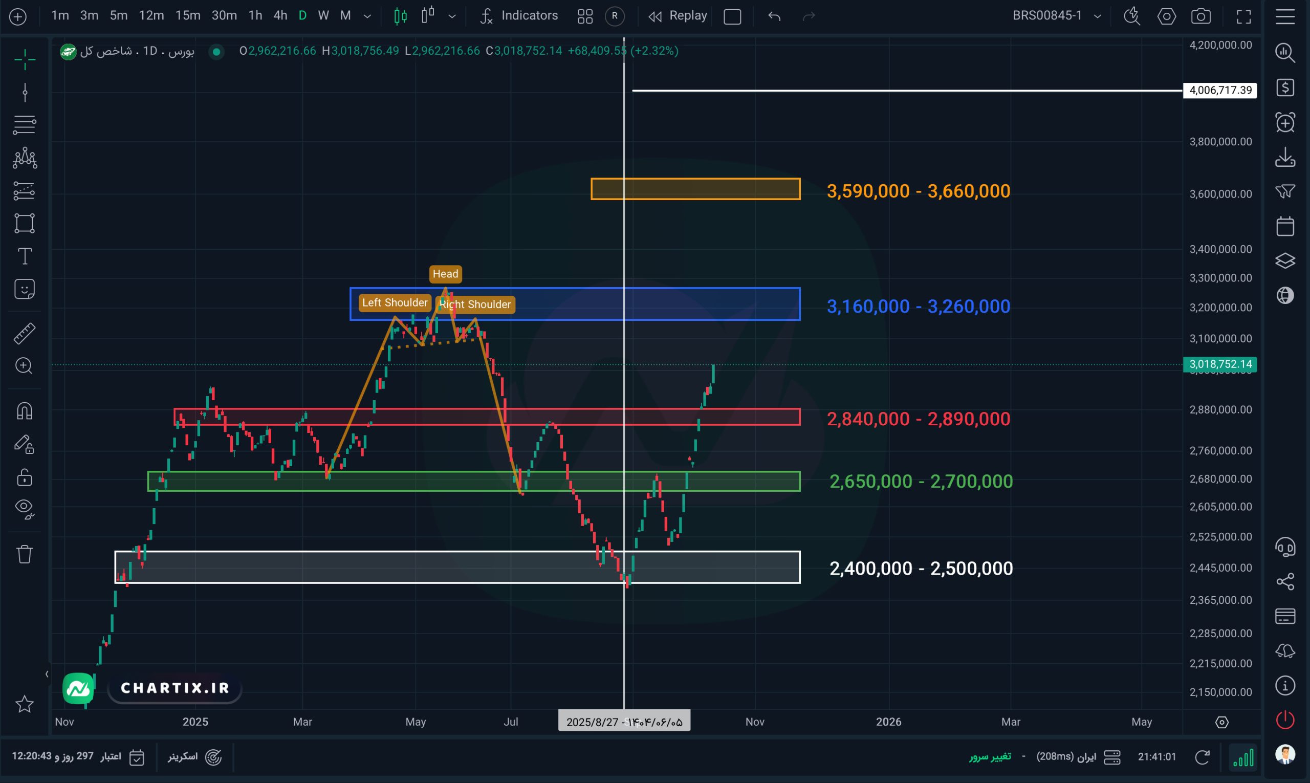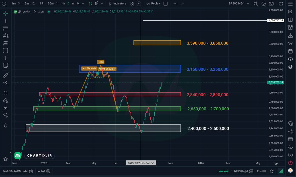 در تایم‌فریم روزانه شاخص کل بورس مشاهده می‌کنیم پس از رشد چشمگیر شاخص در اردیبهشت و خرداد سال جاری و ایجاد سقف تاریخی در محدوده ۳,۱۶۰,۰۰۰ – ۳,۲۶۰,۰۰۰ (محدوده آبی)، رفته‌رفته شاخص روند نزولی خود را آغاز کرده است. شاخص توانسته بود در نزدیکی محدوده آبی‌رنگ، الگوی پرقدرت سر و شانه را نیز ثبت کند که یکی از دلایل مهم این ریزش می‌تواند باشد.
