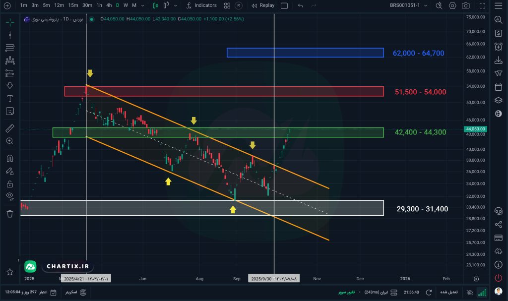 اما در تایم‌فریم روزانه سهام پتروشیمی نوری با نماد نوری مشاهده می‌کنیم پس از یک روند صعودی که تا اوایل اردیبهشت‌ماه سال جاری ادامه داشته است و در همین حرکت، این سهم توانسته سقف تاریخی جدیدی (ATH) در محدوده ۵۱,۵۰۰ – ۵۴,۰۰۰ ریال (محدوده قرمز) ایجاد کند، پس از آن نوری وارد روند نزولی میان‌مدت شده است.