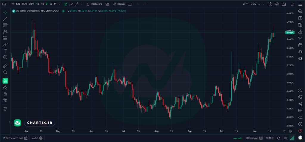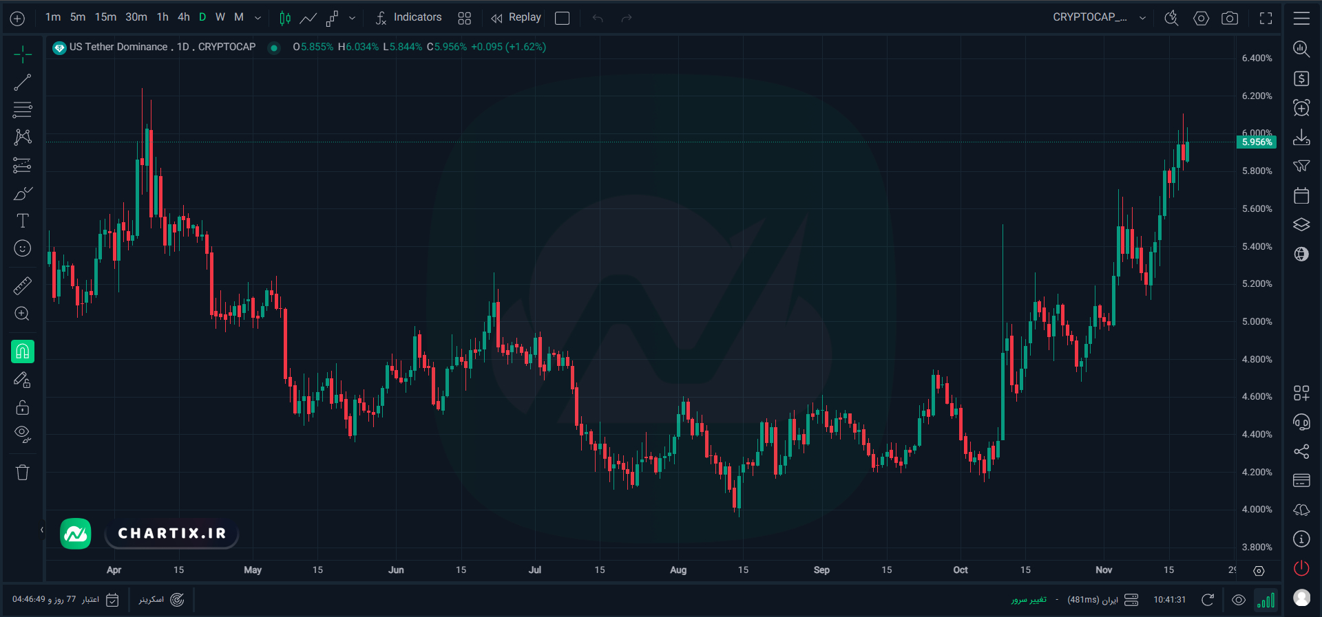 موارد بالا صرفا جهت اطلاع شما از نحوه محاسبه دامیننس تتر بود. اما شما برای دانستن دامیننس این رمز ارز نیازی به طی کردن این مراحل نخواهید داشت. کافیست وارد پلتفرم چارتیکس شده و عبارت دامیننس تتر یا USDT.D را جستجو کنید تا به سادگی چارت دامیننس تتر را در هر تایم فریمی مشاهده کرده و در کنار آن به ابزارهای پیشرفته تحلیل تکنیکال نیز دسترسی داشته باشید.